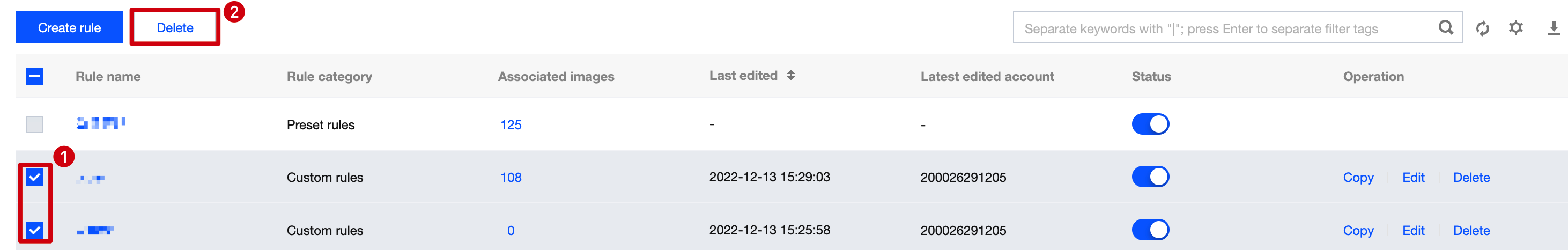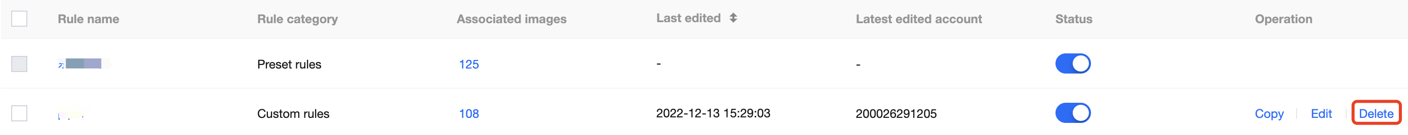 删除后,规则将无法恢复,该规则的关联镜像将自动关联系统默认规则。