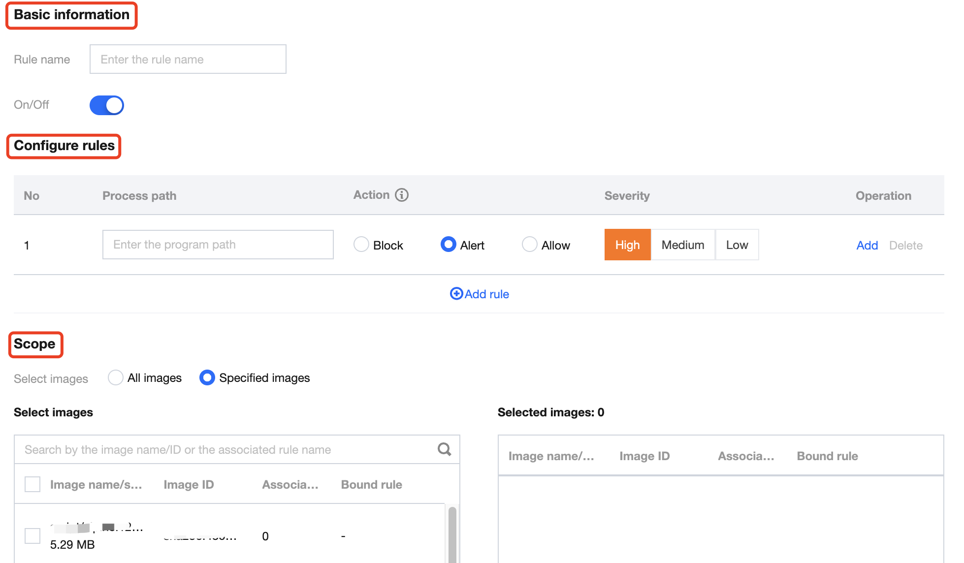 3. 在新增规则页面,需配置基本信息、配置规则和镜像生效范围。