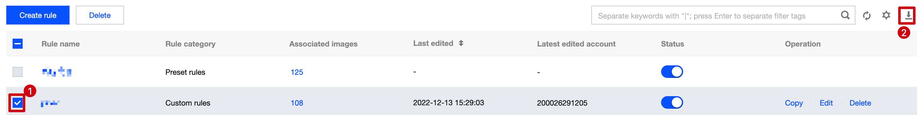 1. 登录 容器安全服务控制台,在左侧导航中,单击高级防御 > 异常进程 > 规则配置,进入规则配置页面。 2. 在规则配置页面,单击图标勾选所需的异常进程规则后,单击图标即可导出异常进程规则。 自定义列表管理