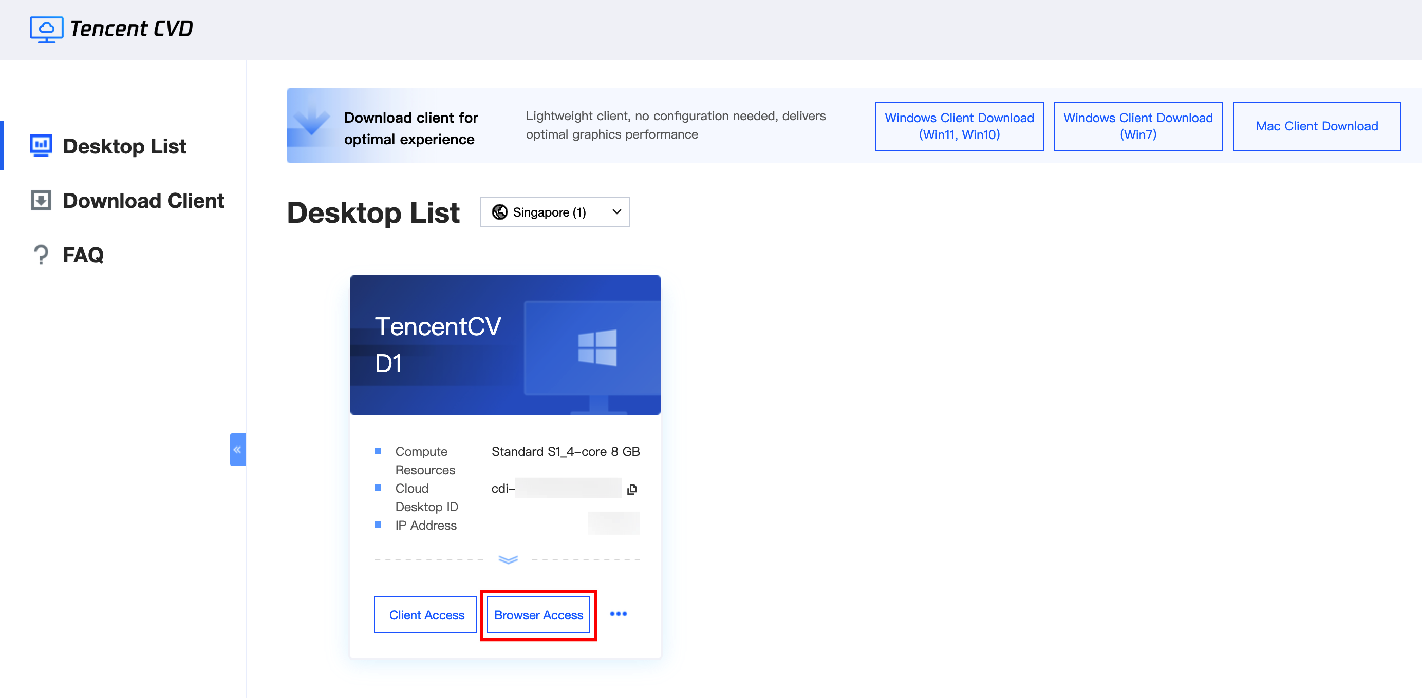 2. 单击 Browser Access(浏览器访问),浏览器模式会自动弹出一个浏览器页签并打开云桌面,后续即可访问云桌面资源。