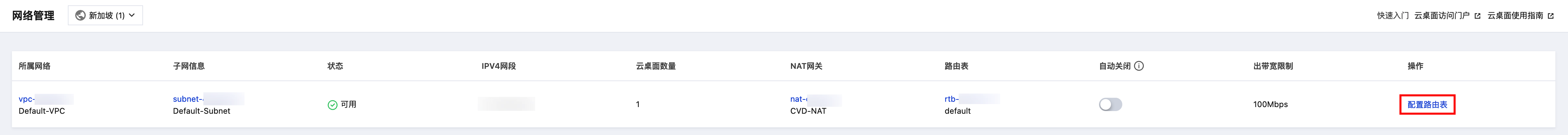 1. 在云桌面控制台 > 网络管理 页面的列表内查看到当前 VPC 或子网已存在 NAT 网关,状态栏为“可用”且操作栏显示为“配置路由表”。 2. 单击配置路由表,确认信息后单击确定为当前子网下的云桌面开通互联网访问。