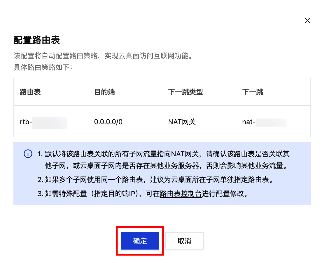 配置路由表操作会默认将该路由表关联的所有子网流量指向 NAT 网关,请确认该路由表是否关联其他子网,或云桌面子网内是否存在其他业务服务器,否则会影响其他业务流量。