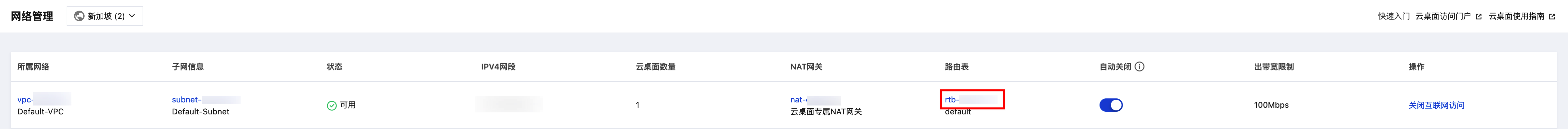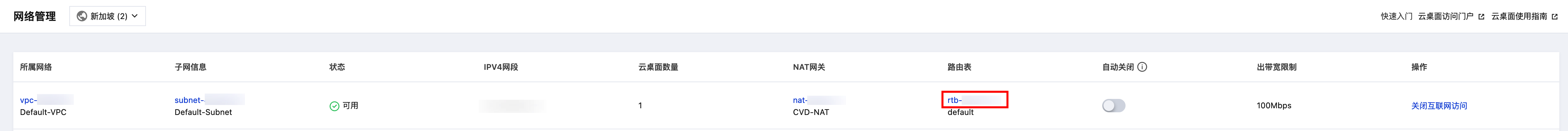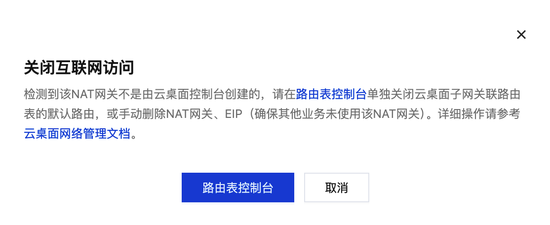 2. 单击关闭互联网访问会弹窗提示该 NAT 网关非云桌面控制台创建,需要在 私有网络控制台 > 路由表 为云桌面关闭互联网访问操作。 3. 打开 路由表控制台 找到云桌面子网使用的路由表,或在云桌面控制台 网络管理 页面内单击路由表 ID 跳转至路由表控制台。 4. 关闭默认路由或删除默认路由即可关闭云桌面互联网访问。