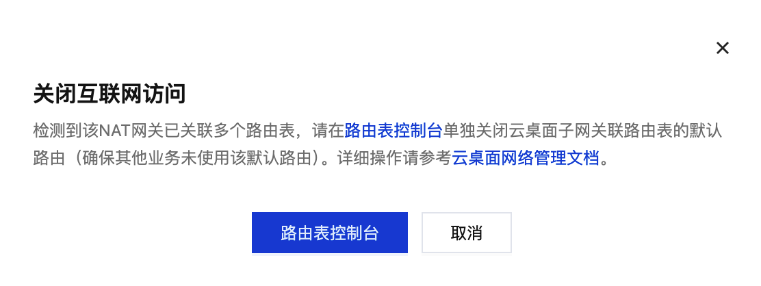 此场景为在云桌面控制台开通互联网访问后,又将云桌面使用的 NAT 网关关联至多个路由表,自动关闭功能将不再适用于此场景,同时无法在云桌面控制台为云桌面关闭互联网访问,需要在 私有网络控制台 > 路由表 找到云桌面子网所使用的路由表,关闭默认路由或删除默认路由即可关闭云桌面互联网访问。 1. 在云桌面控制台关闭互联网访问时,会检测该 NAT 网关是否关联至多个路由表,如果关联至多个路由表,则需要在 私有网络控制台 > 路由表 进行操作。 3. 关闭默认路由或删除默认路由即可关闭云桌面互联网访问。