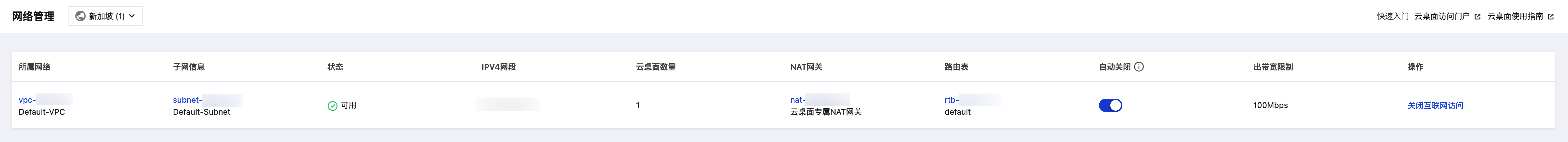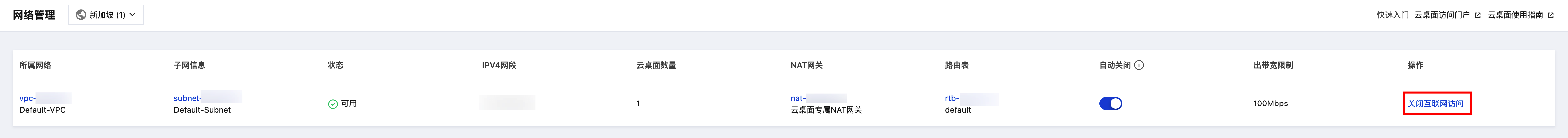4. 开通完成后,网络管理列表内的状态变为“可用”且操作列中变为“关闭互联网访问”时,代表已成功开通互联网访问,此时可在云桌面内访问互联网。