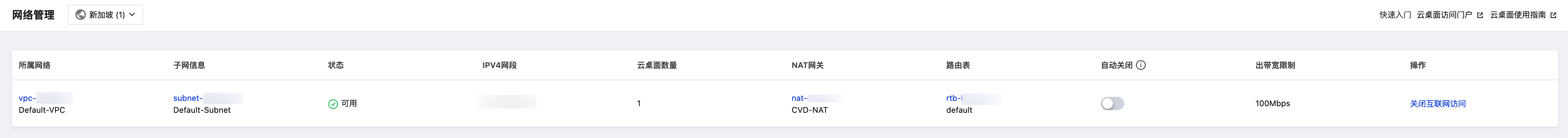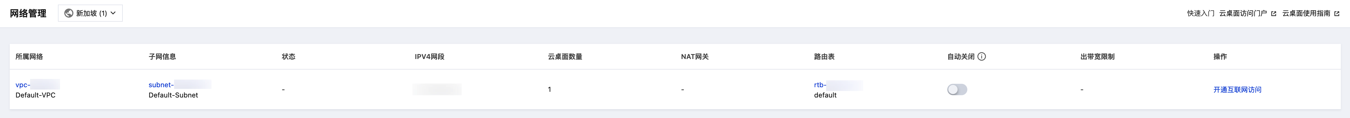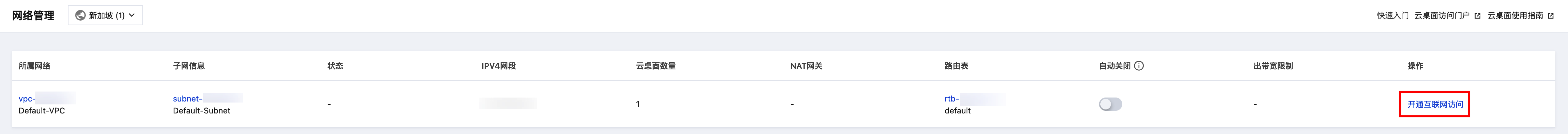 5. 关闭完成后,网络管理列表内的状态变为“ - ”且操作栏变为“开通互联网访问”时,代表已成功关闭互联网访问,此时云桌面将无法访问互联网。