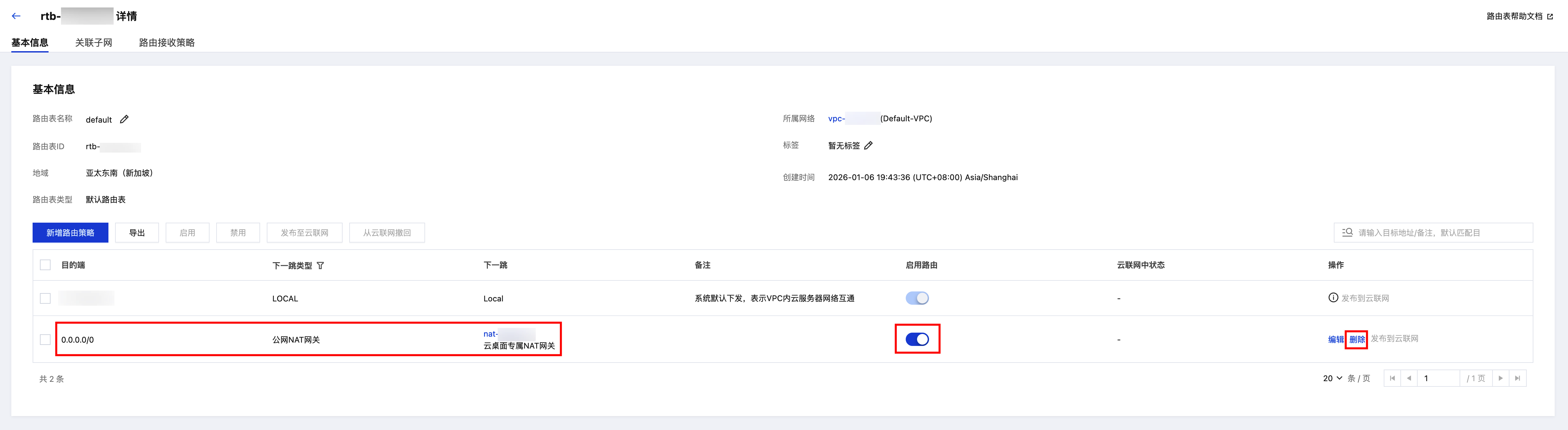关闭或删除路由表默认路由会影响该路由表所关联的全部子网网络流量,关闭或删除前请确认路由表是否关联其他业务子网,以免影响其他业务。
