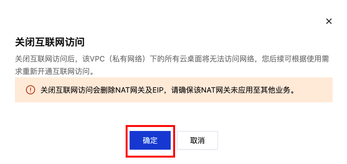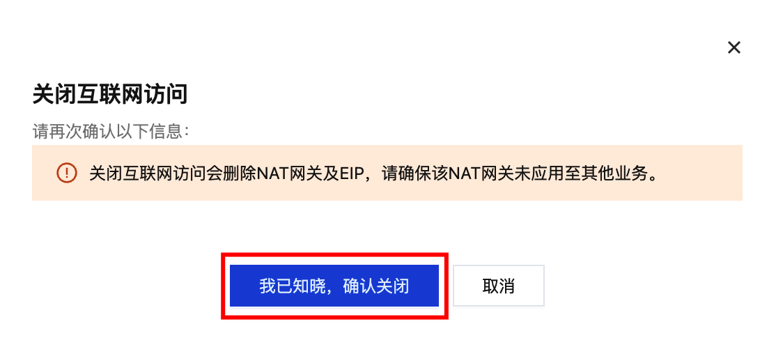 3. 关闭互联网访问会删除 NAT 网关及 EIP,请确保该 NAT 网关未应用至其他业务,单击确定。