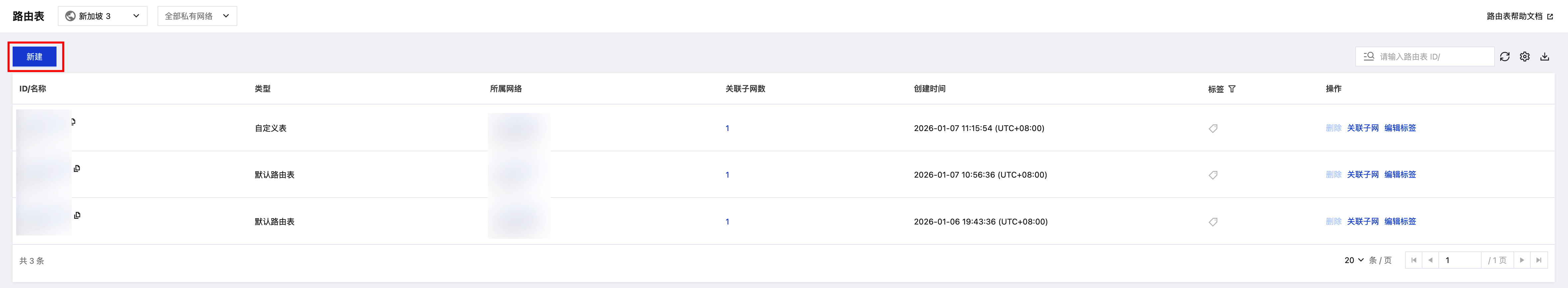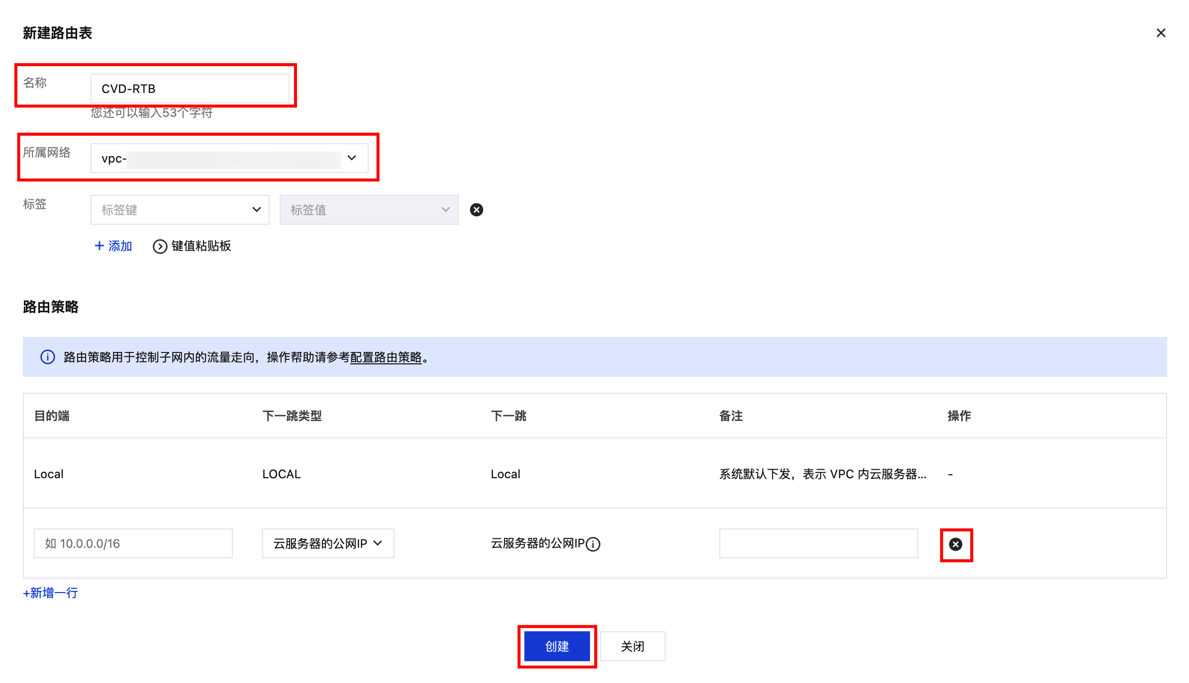 1. 登录私有网络控制台,在 路由表 页面单击新建。 2. 在新建路由表弹窗内,输入路由表名称、选择所属网络(云桌面所在 VPC)、删除默认新增的路由策略,单击新建。