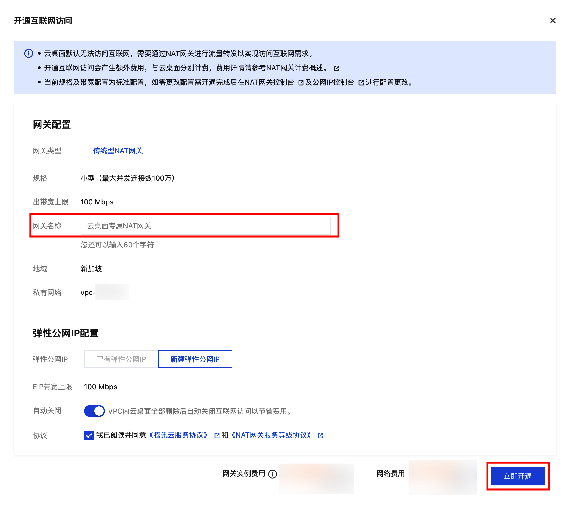 开通互联网访问会创建按量计费的 NAT 网关及 EIP,出网带宽默认为100M,如需更高带宽,可在 NAT 网关控制台 进行修改。 步骤1:服务授权