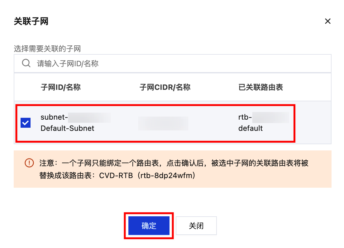 4. 选择云桌面所在子网,如果存在多个子网,请谨慎操作,避免影响其他子网路由,单击确定,完成为云桌面子网单独指定路由表。