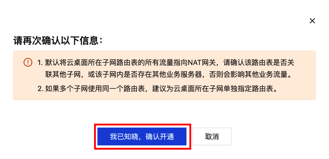 3. 确认提示信息,如无影响单击我已知晓,确认开通,即可为云桌面开通互联网访问。