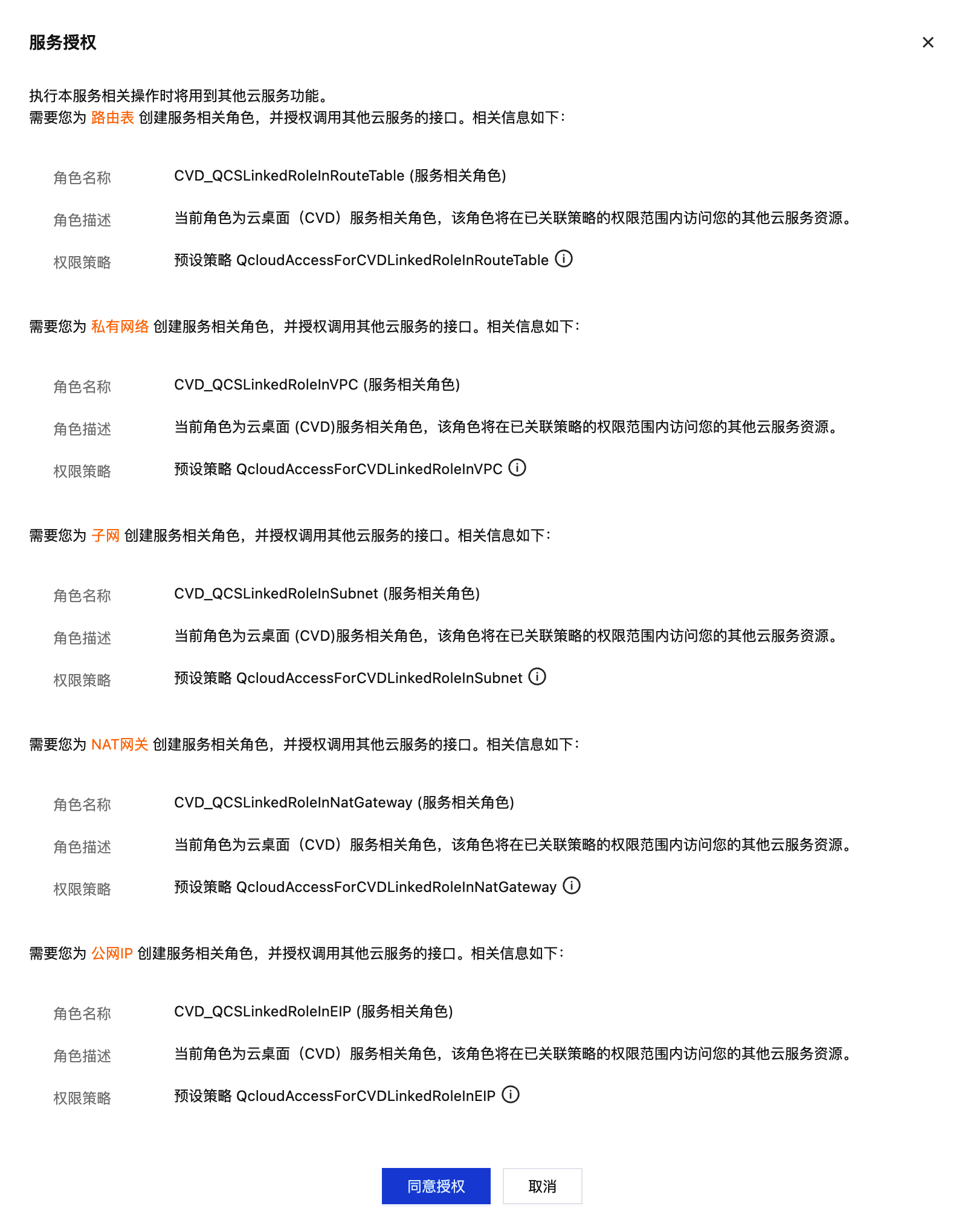 为云桌面产品开通互联网访问,会使用到其它腾讯云服务(VPC、子网、NAT 网关、公网 IP、路由表),需要授权云桌面调用其他云服务的接口进行相关操作(创建、修改、查询、删除)。