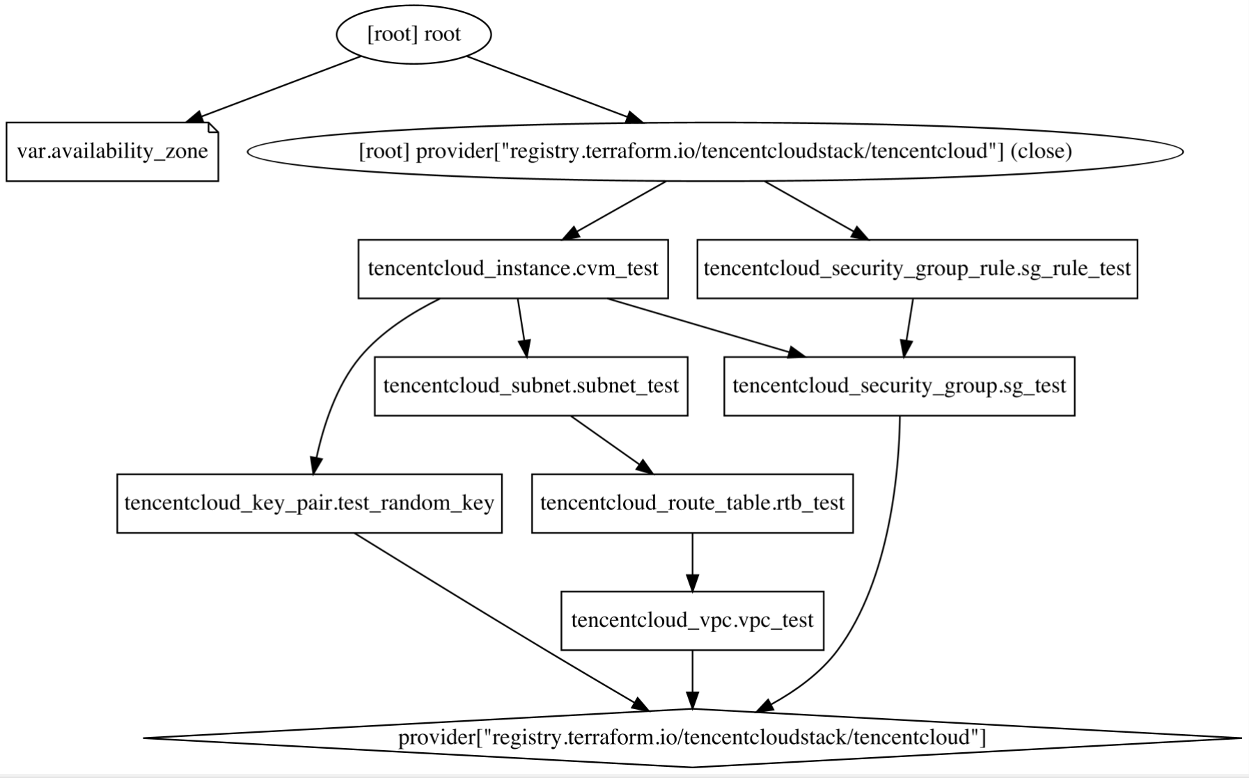 该命令生成 DIR 路径下的代码锁描述的 Terraform 资源的可视化依赖图(如果 DIR 参数缺省则使用当前工作目录)。-type:用来指定输出的图表的类型。Terraform 为不同的操作创建不同的图。代码文件默认类型为 "plan",变更计划文件默认类型为 "apply"。-draw-cycles:用彩色的边高亮图中的环,可以帮助分析代码中的环错误(Terraform 禁止环状依赖)。-type=plan:生成图表的类型。包含 plan、plan-destroy、apply、validate、input、refresh。terraform graph 命令输出的是 DOT 格式的数据,可通过以下命令 GraphViz 转换为图形文件:terraform graph | dot -Tsvg > graph.svg