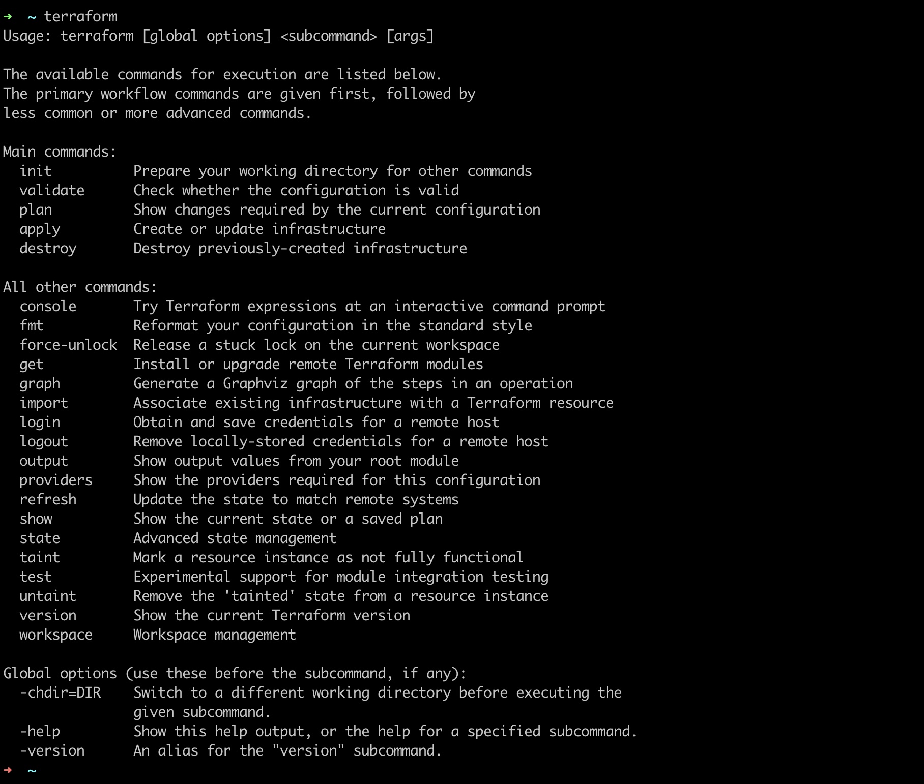 terraform查看完整命令列表。