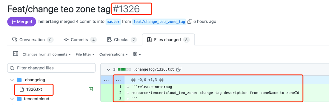 .txt变更文件来描述您这次更改的内容。之后我们会通过 go-changelog 工具,解析.changelog目录中的 txt 文件,生成 CHANGELOG.md。CHANGELOG.md 的更新规则如下:.changelog目录下,名称为{PR-NUMBER}.txt。例如,PR 的 Number 是1326,则应该有一个名为.changelog/1326.txt的变更日志。