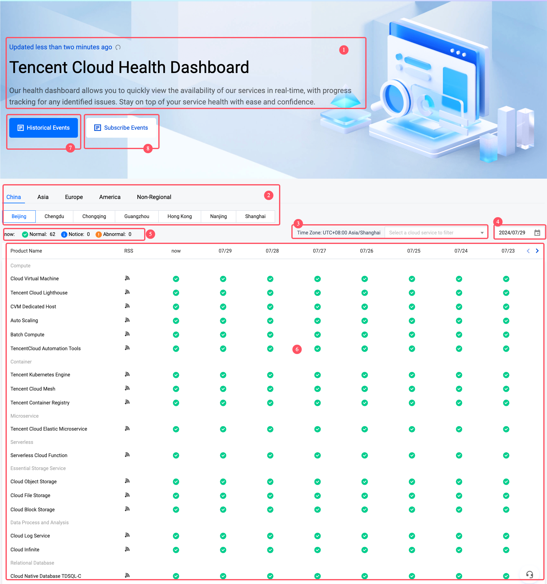 腾讯云健康看板分为以下几个区域: