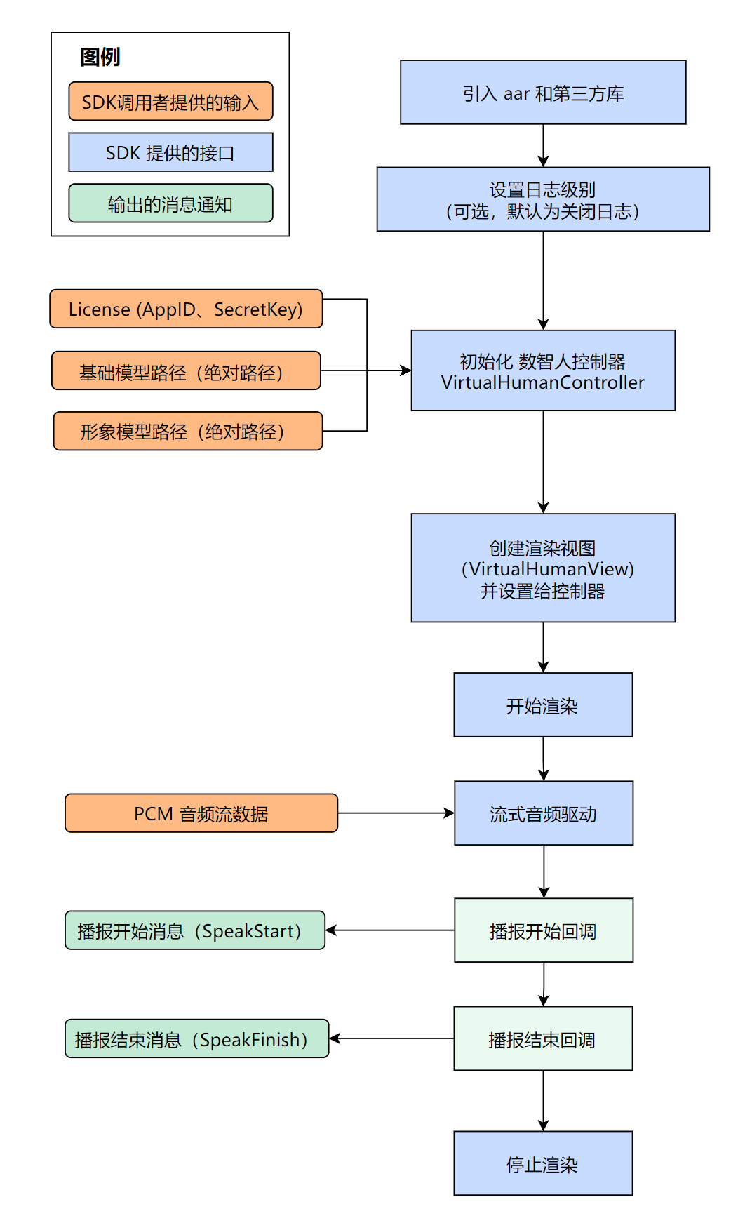VirtualHumanParam vhParam = new VirtualHumanParam();// 本地模型路径vhParam.humanModelPath = "/data/user/0/com.tencent.virtualhuman_2d_demo/files/test_model/human_model";// 本地模型路径vhParam.commonModelPath = "/data/user/0/com.tencent.virtualhuman_2d_demo/files/test_model/common_model";vhParam.appId = "License的appId";vhParam.secretKey = "License的secretKey";vhParam.deviceName = "设备标记,建议用铭牌信息";// 错误回调函数vhParam.errorCallback = (code, message) -> {Log.d(TAG, "Code: " + code + ", Message: " + message);};// 事件回调函数vhParam.eventCallback = (code, message) -> {Log.d(TAG, "Code: " + code + ", Message: " + message);};controller = new VirtualHumanController(this, vhParam);int ret = controller.initHuman();if (ret == 0) {controller.setRenderView(virtualHumanView);// 设置渲染视图controller.startHuman();// 开始渲染} else {Log.i(TAG, "init fail=" + ret);}
