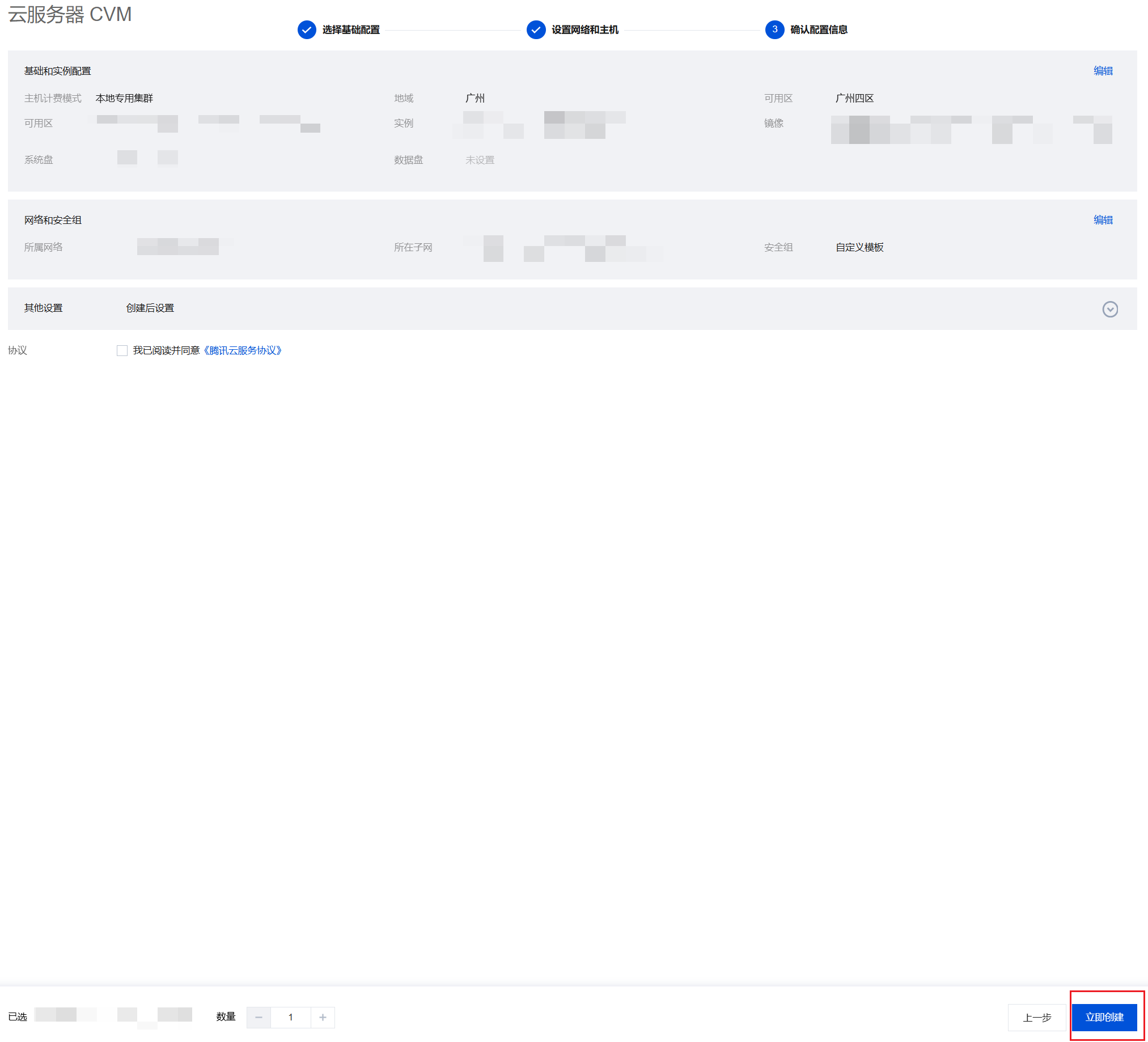 6. 确认您的配置信息,阅读并勾选我已阅读并同意《腾讯云服务协议》,单击立即创建,即完成 CVM 的创建。 7. 在您专用集群的资源管理页可查看创建的 CVM 信息,单击 CVM 实例 ID,即可进入 CVM 控制台查看您实例的详细信息。