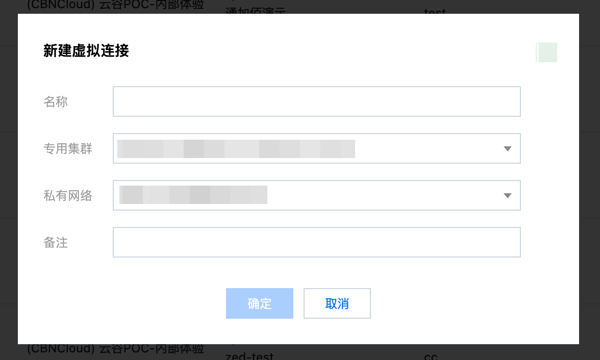 3. 在弹出的新建虚拟连接窗口中,完成以下配置,单击确定: