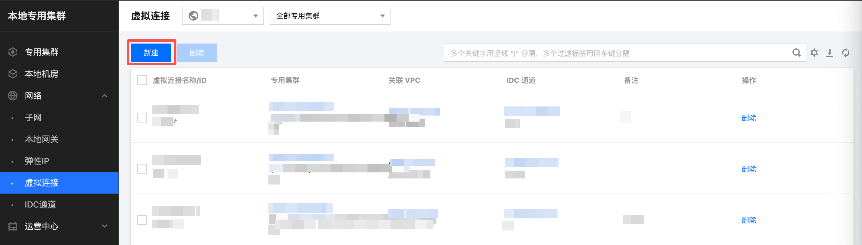 虚拟连接功能需开通白名单后使用控制台管理页面,如需使用,请联系 在线支持 处理。 2. 在虚拟连接列表管理页面中,单击新建。