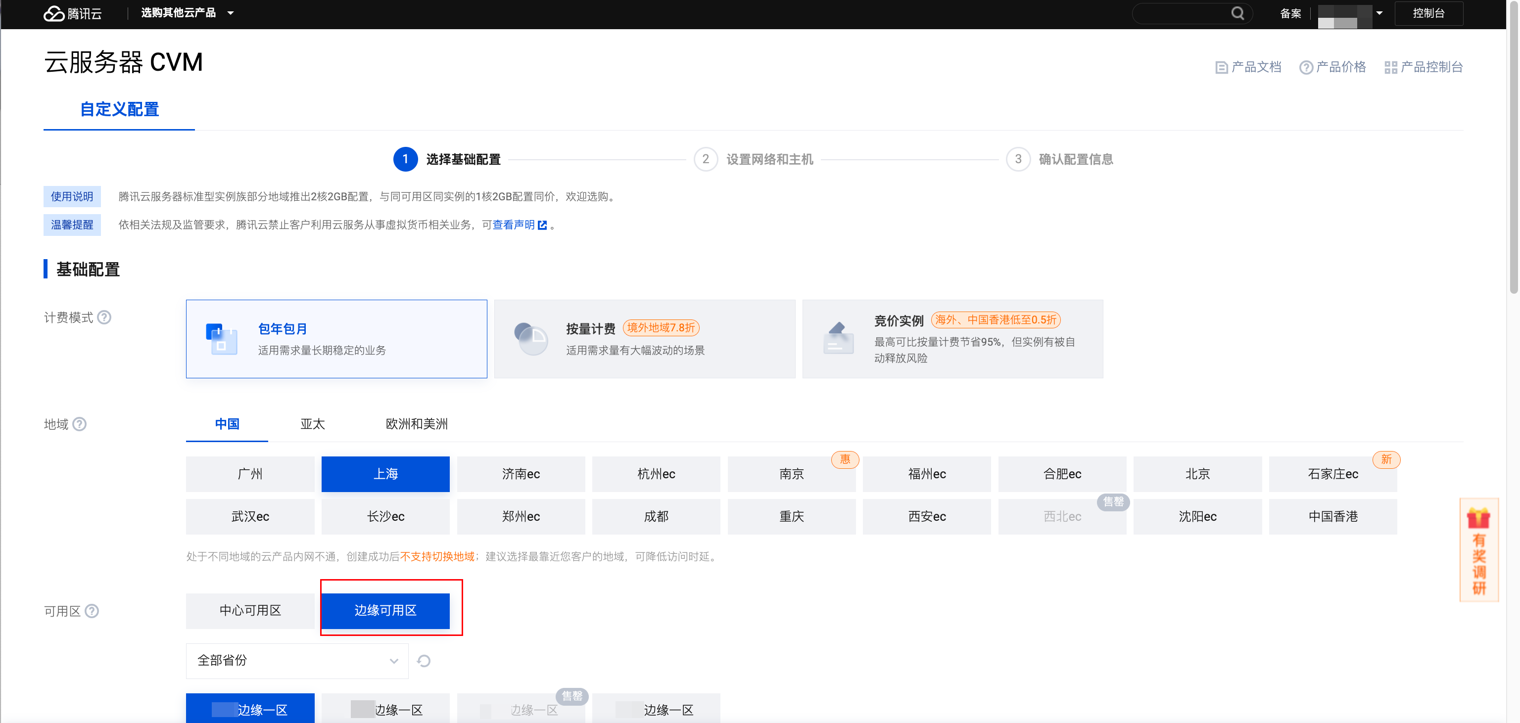 3. 您可登录 CVM 实例页面,单击新建,进入购买页。在购买页下,可以看到边缘可用区选项,选中合适的可用区后参照提示配置规格、镜像、磁盘等参数即可,整体购买体验类似 CVM。