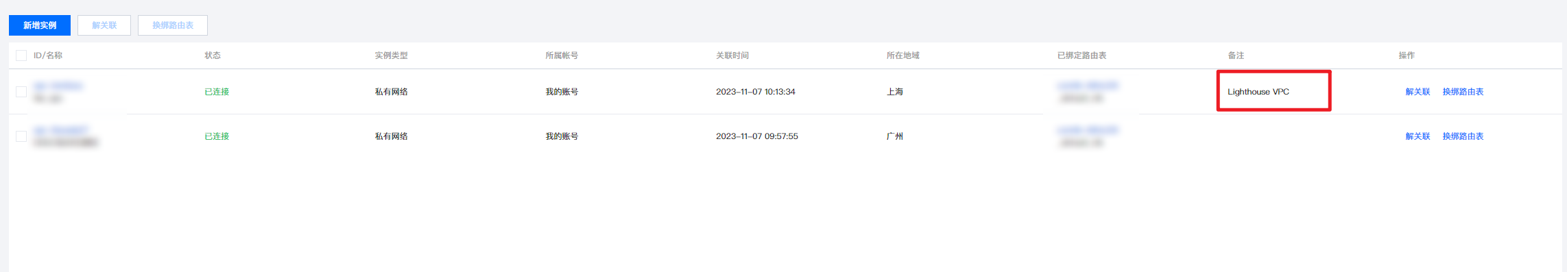 3. 在关联实例页面,备注为 Lighthouse VPC 的即为该轻量服务器的 VPC,另一 VPC 则为与之互联的私有网络 VPC。