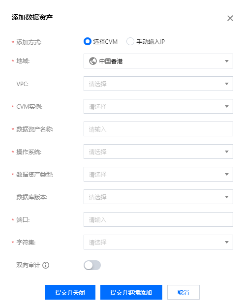 2. 在自建数据库页面,单击添加数据资产,选择所需参数,单击提交并关闭即可完成添加。