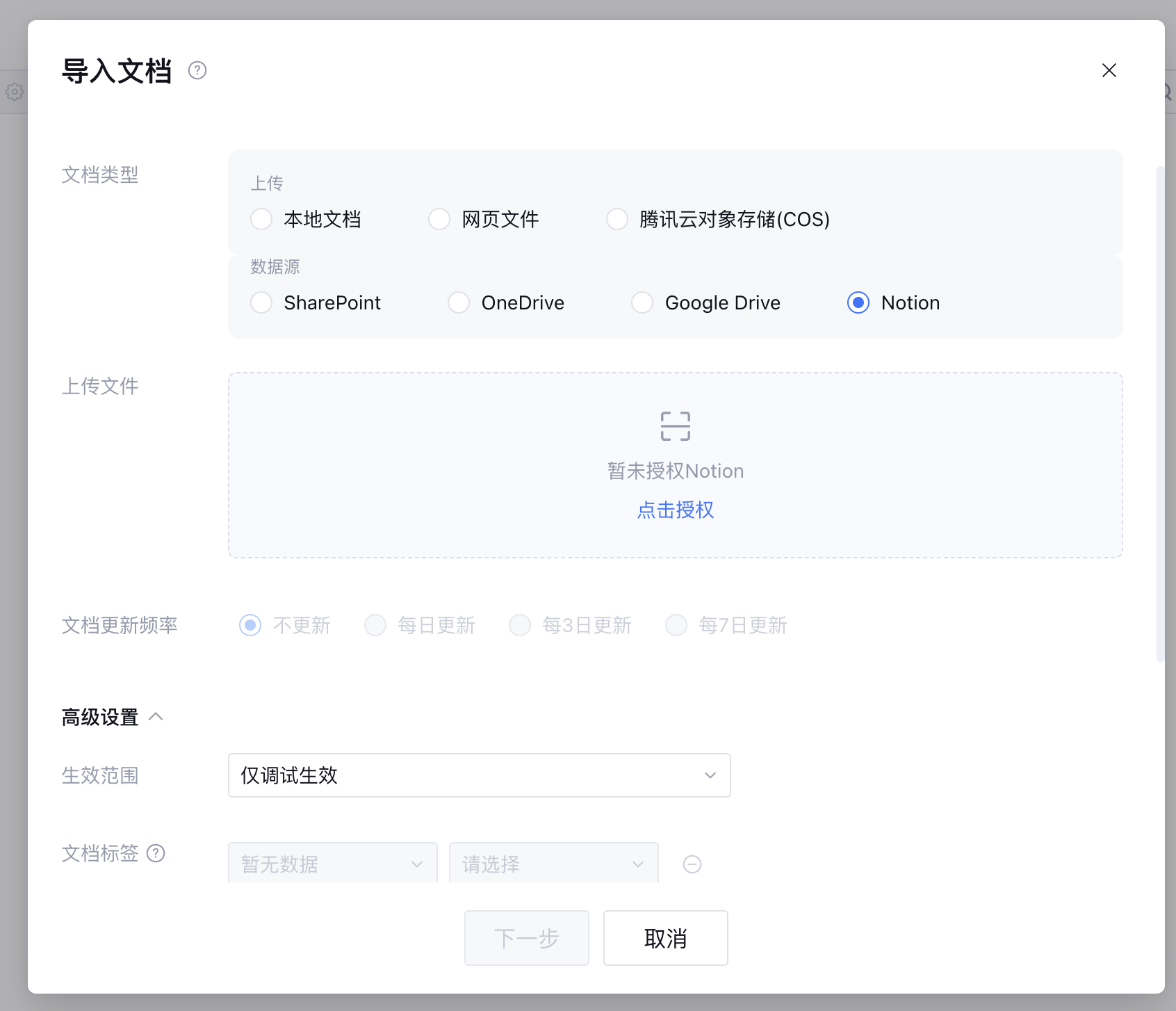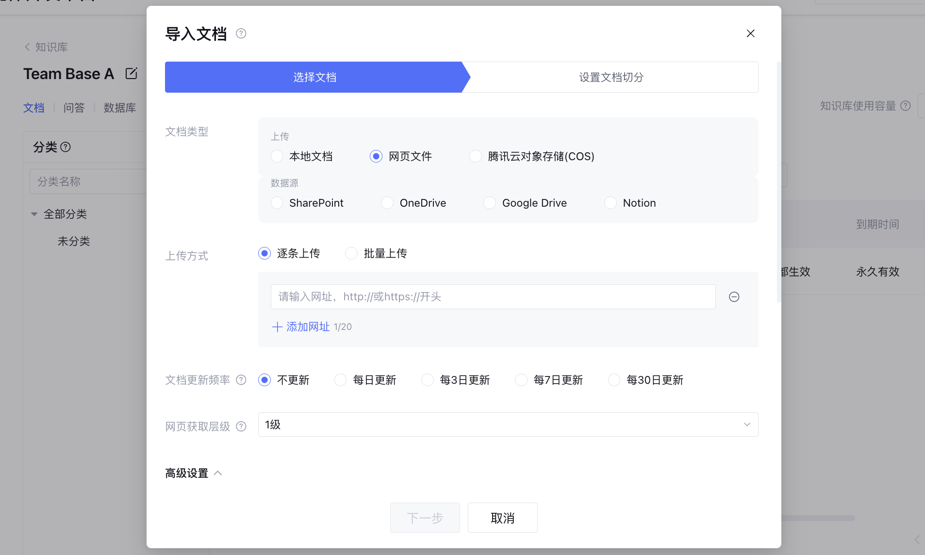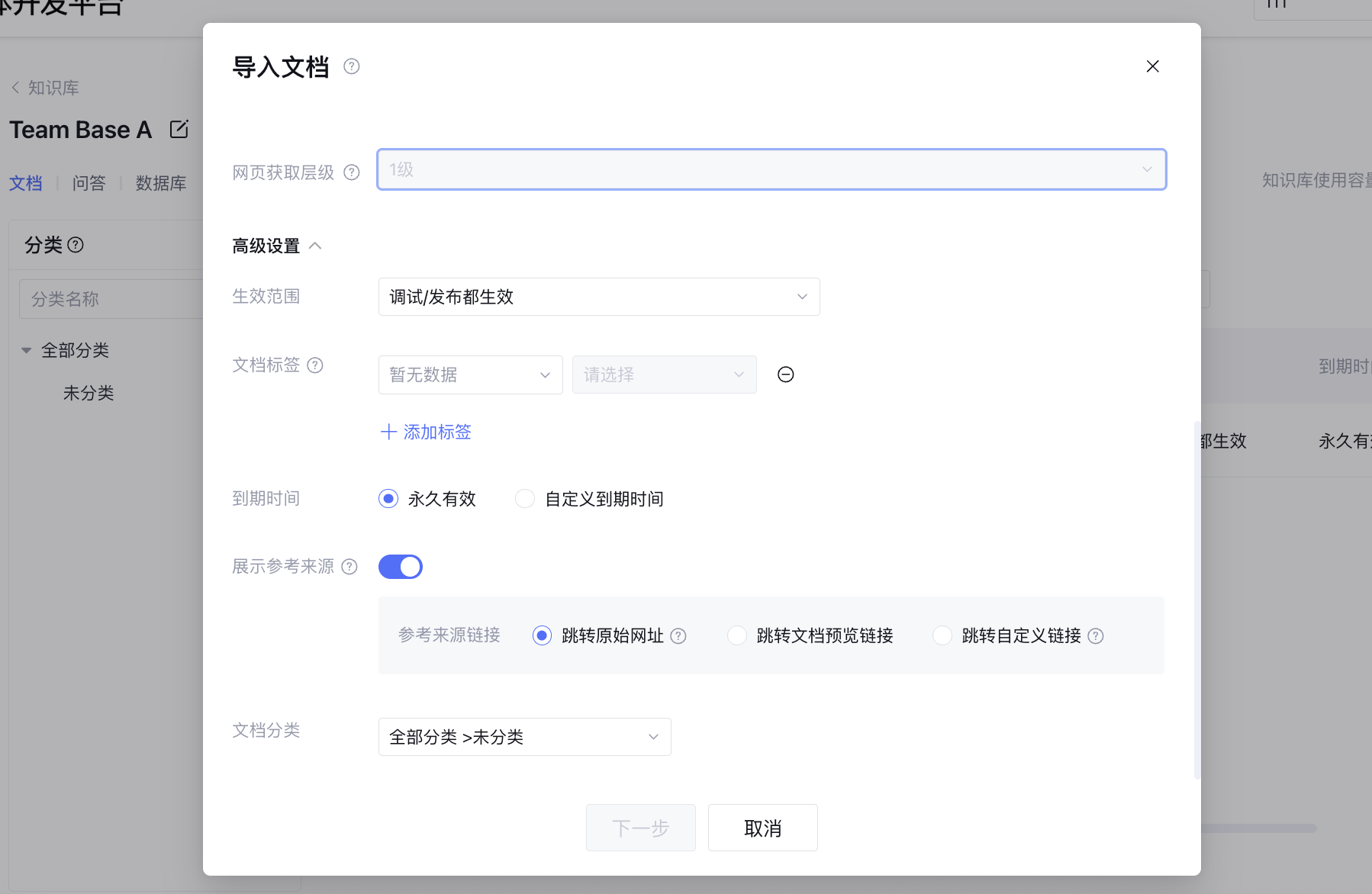 3. 按照需求配置文档更新频率和高级设置,包括生效范围、文档标签、到期时间、参考来源和文档分类。