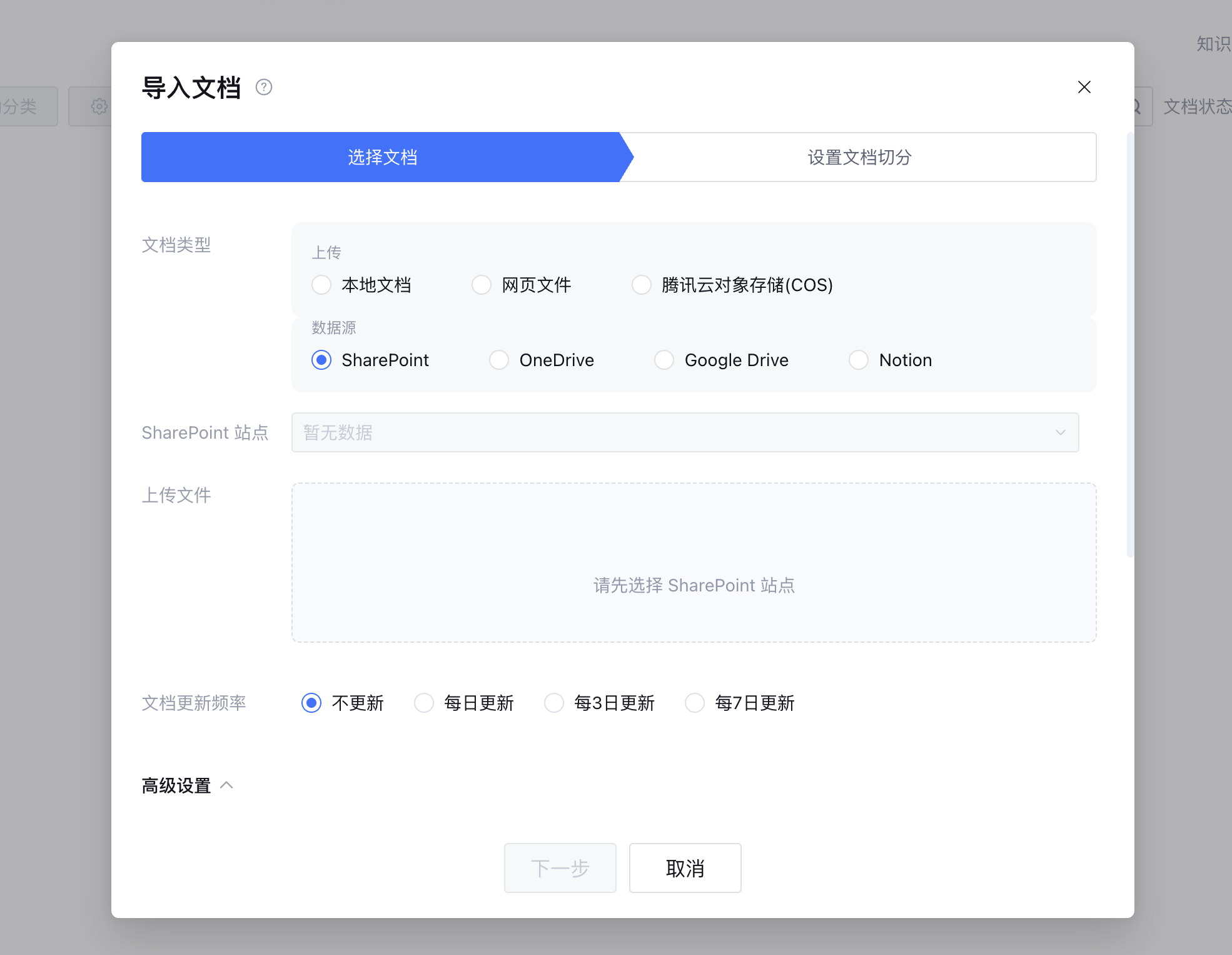 5. 按照需求配置文档更新频率和高级设置,包括生效范围、文档标签、到期时间、参考来源和文档分类。