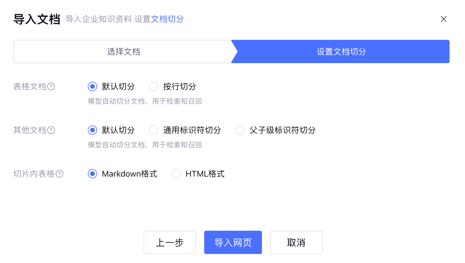 4. 设置文档切分规则,通过 文档切分设置 了解如何切分文档,完成后点击导入网页