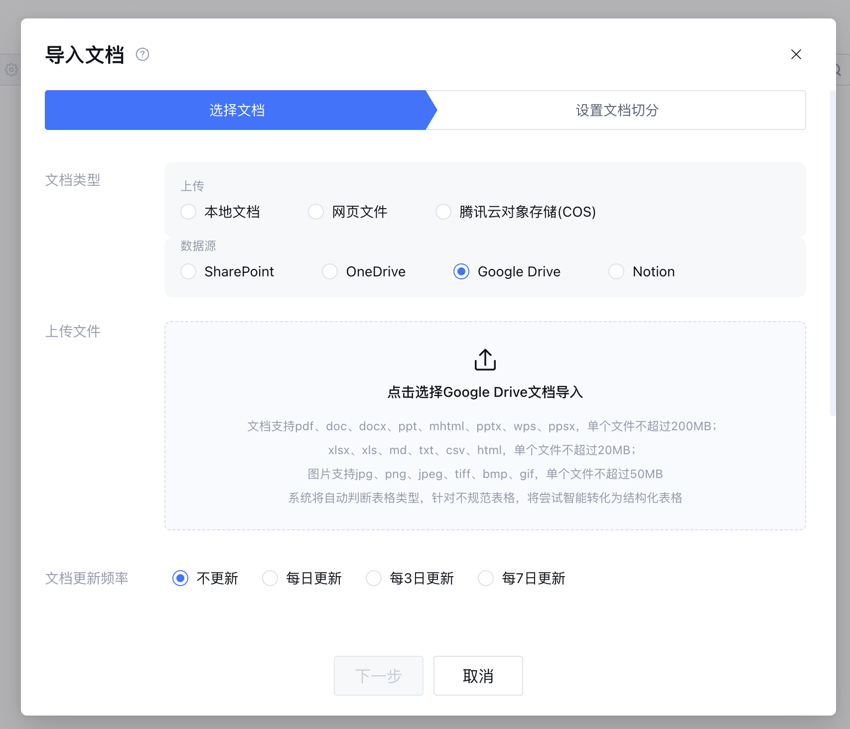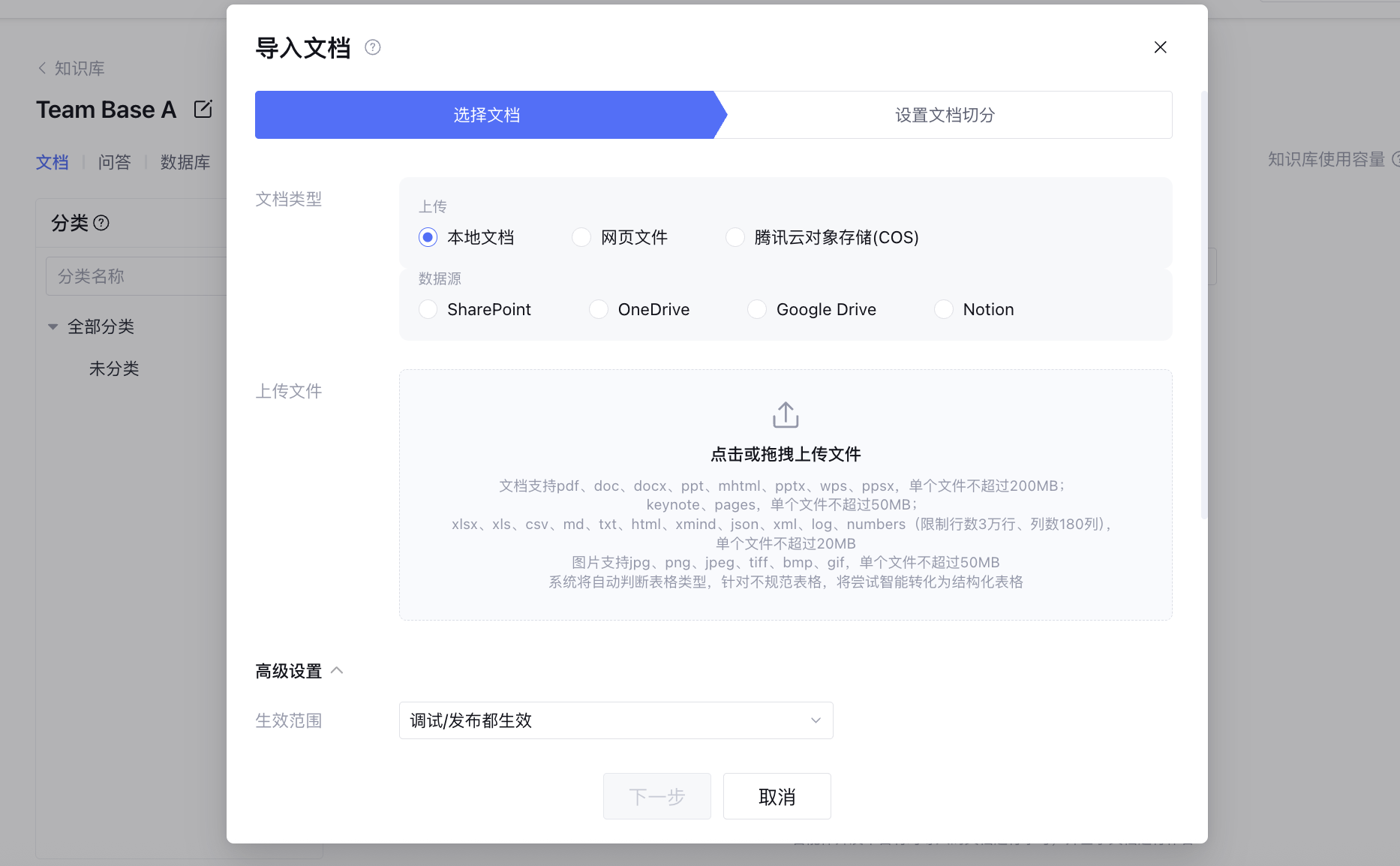 3. 设置文档切分规则,通过 文档切分设置 了解如何配置,完成后单击导入文档