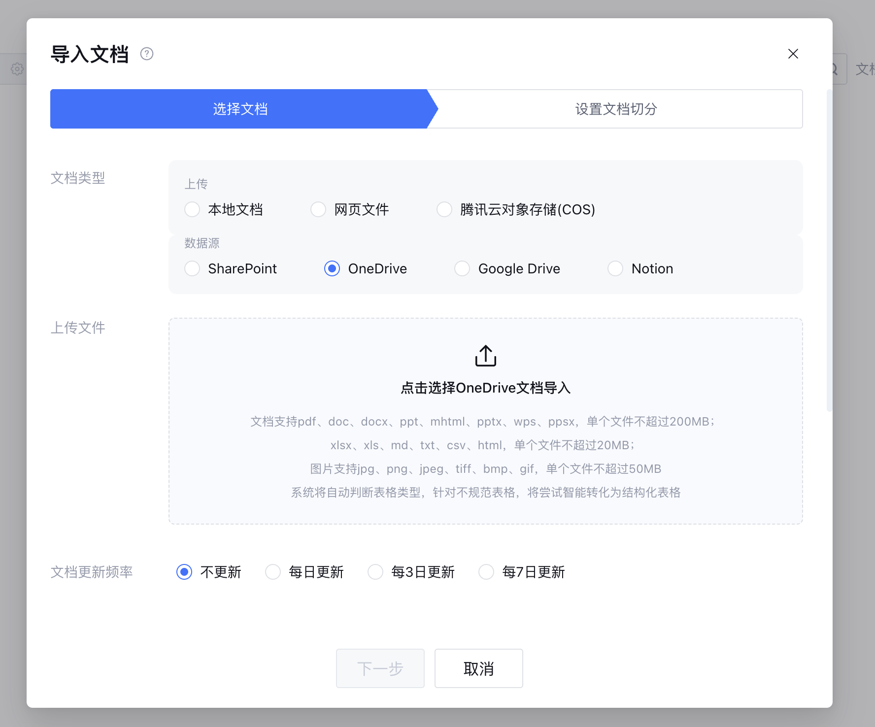 2. 根据页面提示,完成 OneDrive 授权后,选择需要导入的文档。