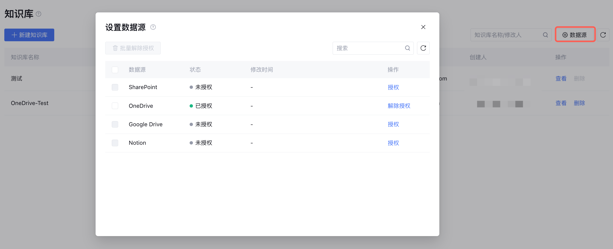 您可在知识库设置中统一管理数据源,包括授权、解除授权和批量解除授权。