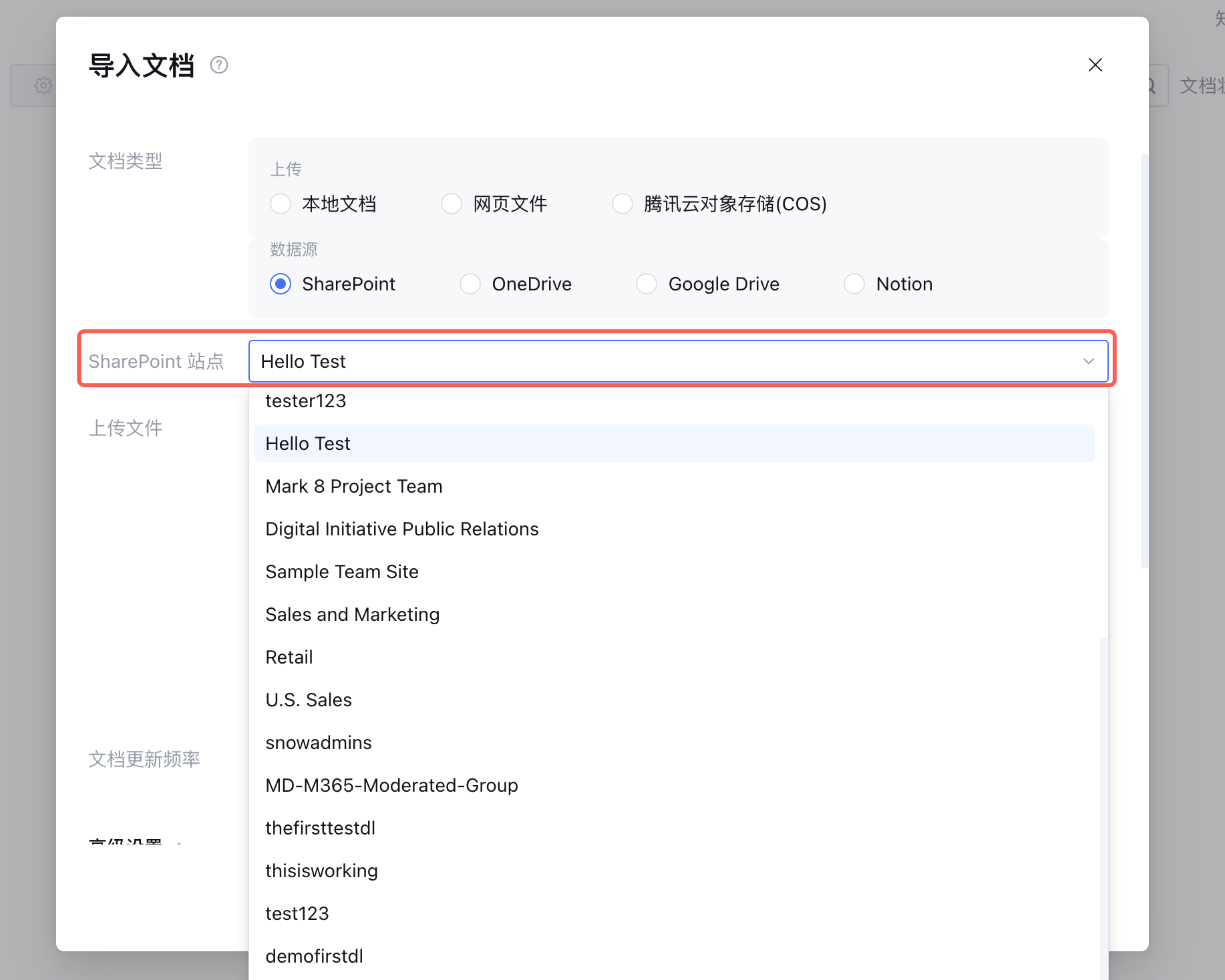 3. 选择需要导入的文档所在的 SharePoint 站点。