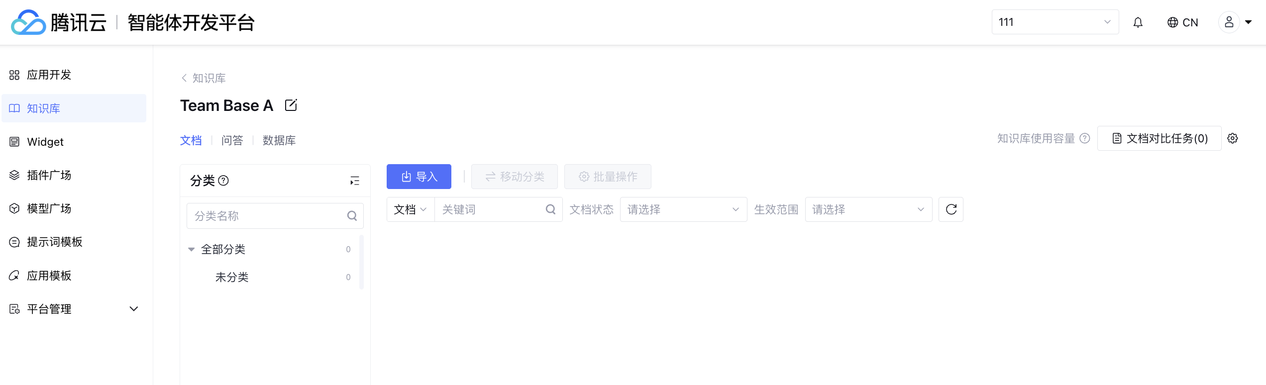 单击左侧的知识库,单击知识库操作栏中的查看,即可进入知识管理界面,对文档类知识进行管理。支持导入文档、下载文档、删除文档及文档分类。