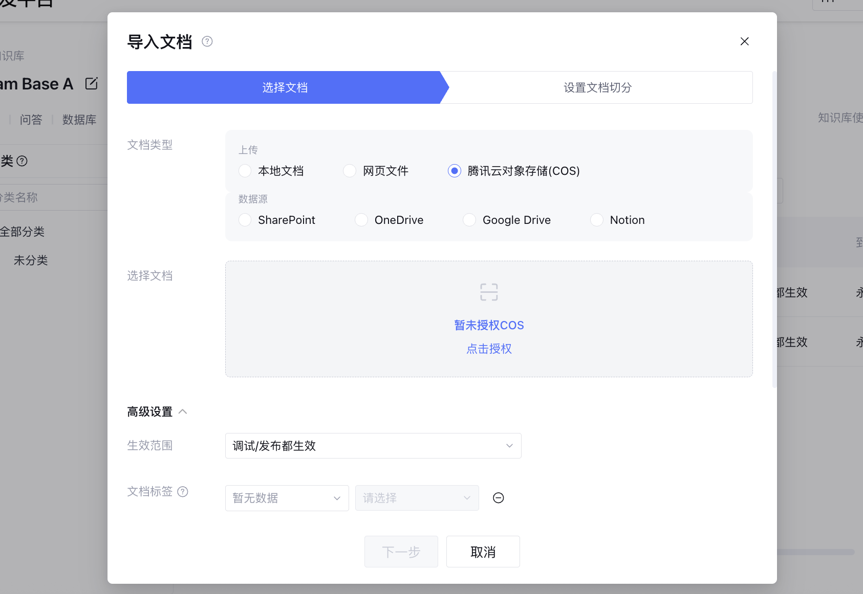 2. 根据页面提示,完成 COS 授权后选择需要导入的文档。