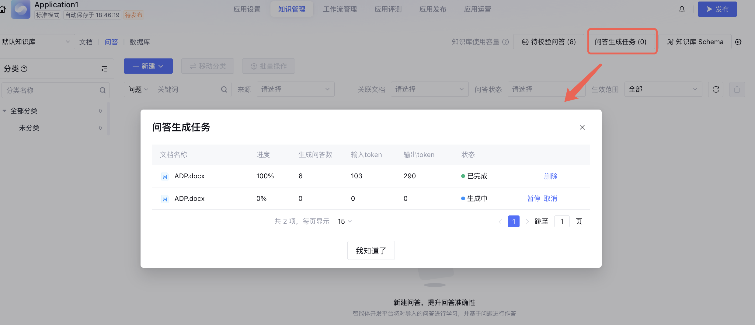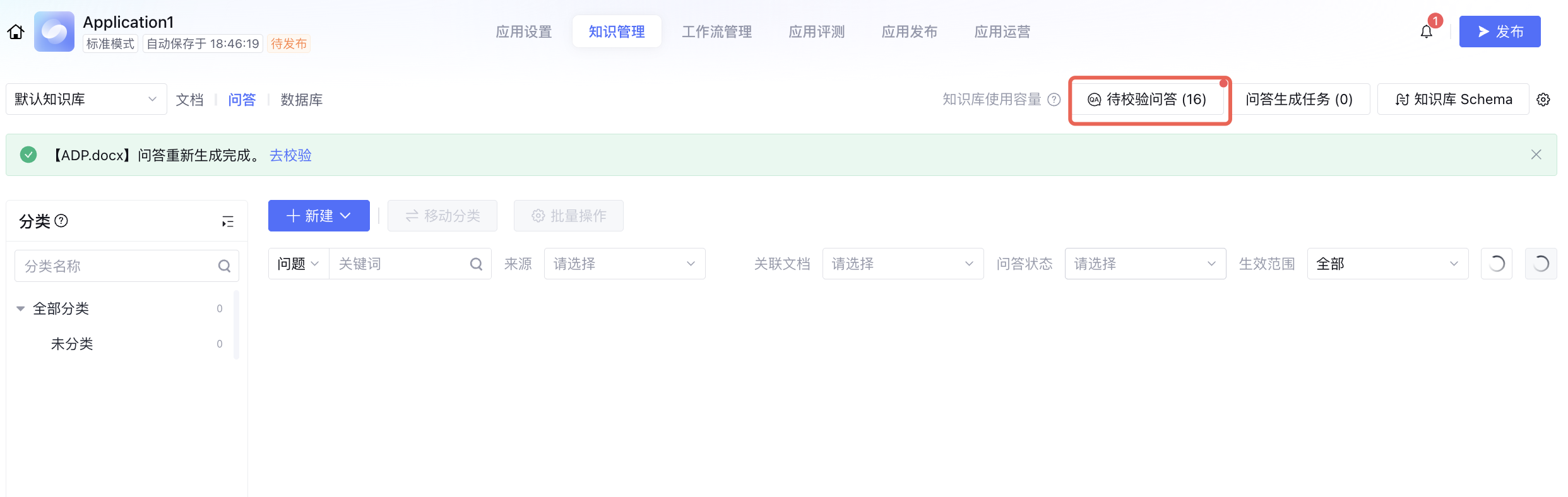 4. 问答生成完成后,将通过置顶消息和站内信的形式进行提示。您可以在待校验问答中进行查看自动生成的问答对。