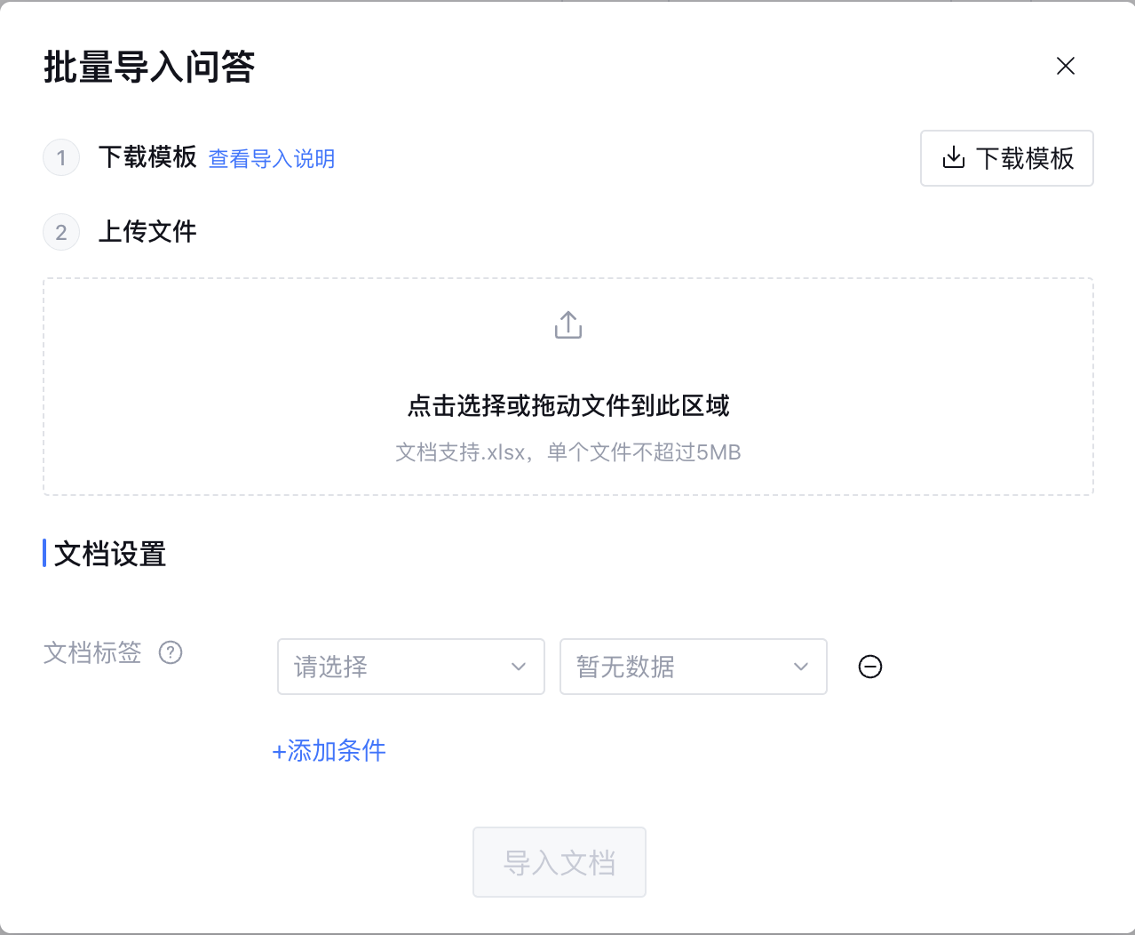 从文档生成问答仅支持从系统已导入的文档中生成问答,使用本功能前请先在知识库 > 文档中导入文档,相关步骤参见 文档概述