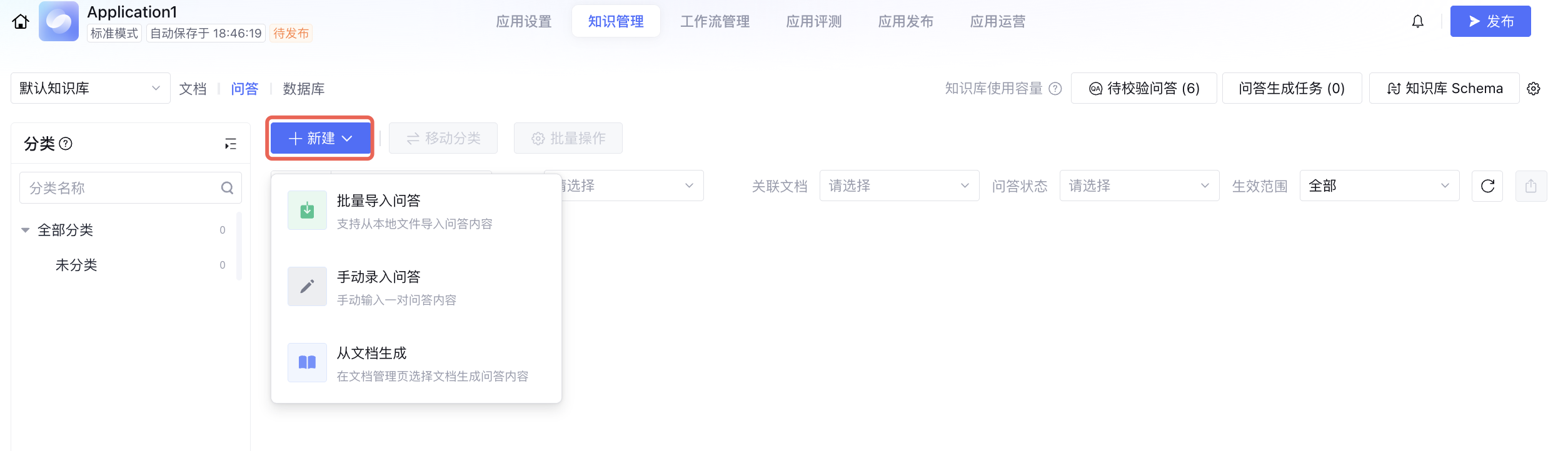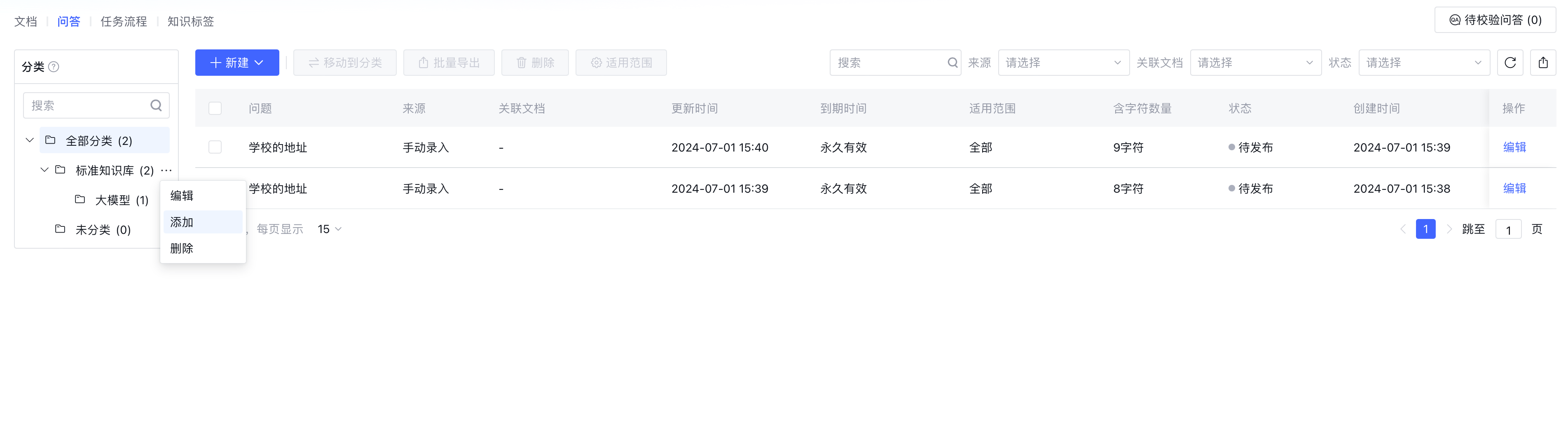 知识库问答应用支持新建问答、移动问答、导出问答、校验问答、问答分类。录入问答之后,当客户输入问题时,会将客户问题和问答库中的问题进行检索匹配,相似度达到一定阈值后,会输出对应回答。