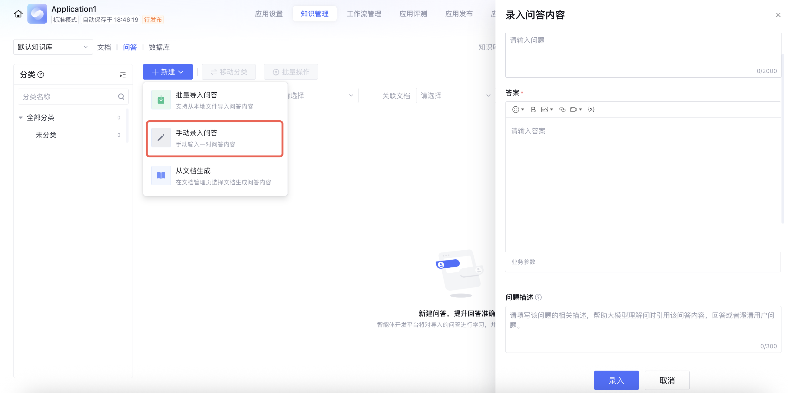 2. 单击新建,显示新建问答下拉框,选择手动录入问答,弹出录入问答窗口。