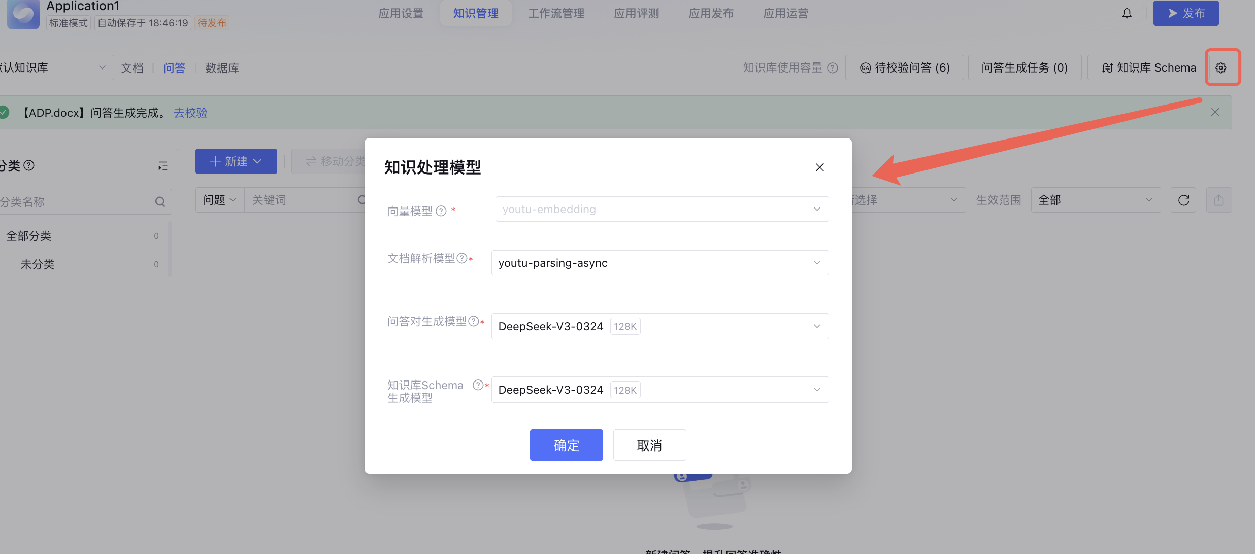 一键生成相似问将消耗用户的 token 资源,可在知识管理/知识库中,自定义知识库模型中的问答生成模型