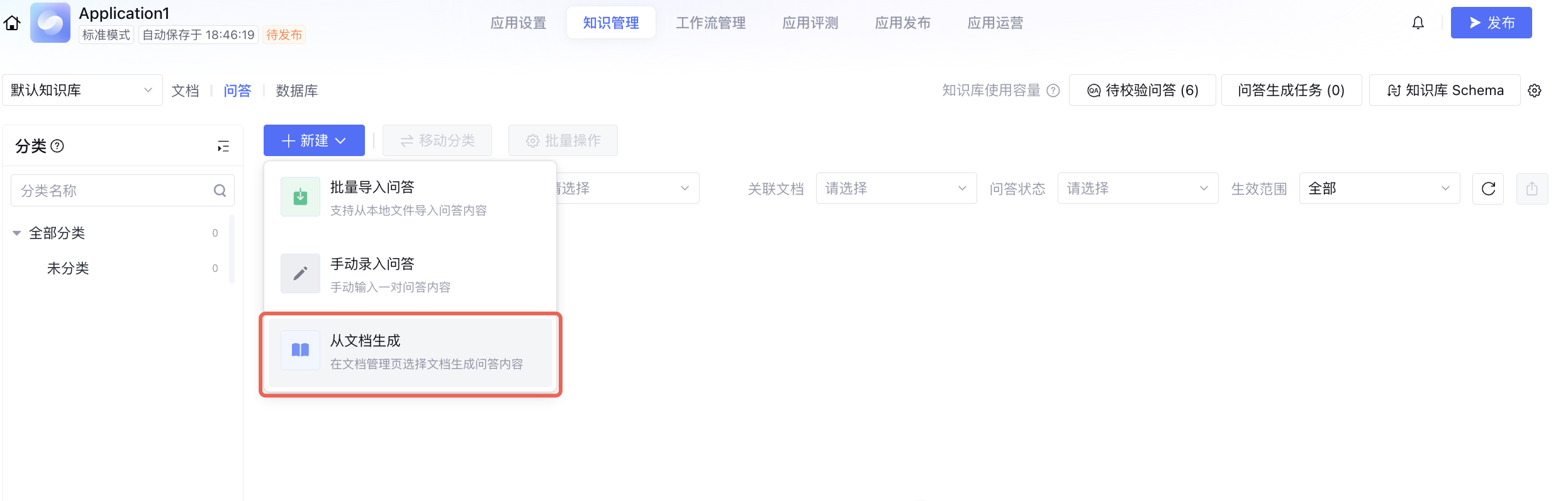 2. 单击新建,显示新建问答下拉框,选择从文档生成,弹出录入问答窗口。