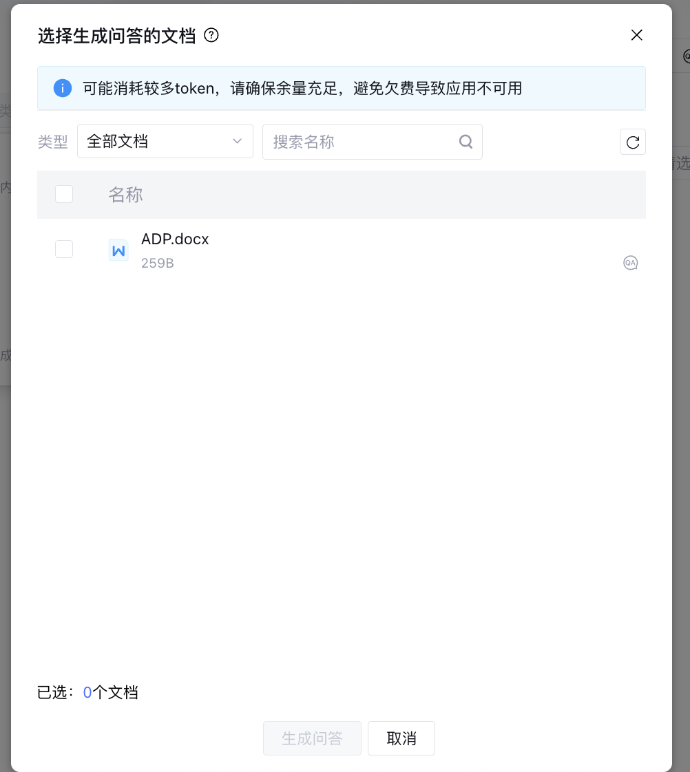 3. 进入选择文档页面,选择文档后,单击生成,后台将基于所选文档生成问答。