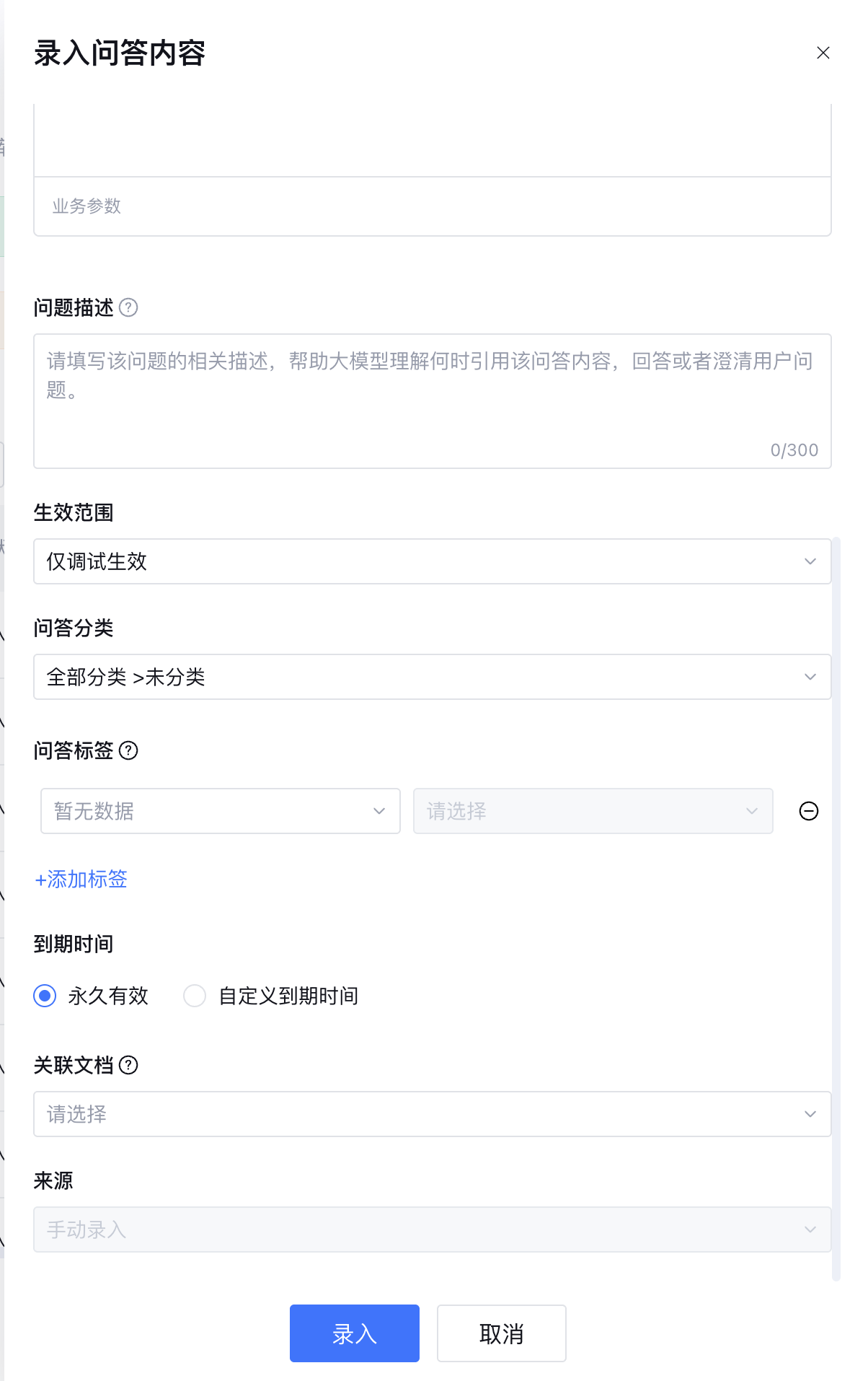 到期时间:问答知识的生效时间设置,可设置永久有效或自定义到期时间。若设定了自定义到期时间,在到期时间后,该问答知识将会自动失效。从文档生成的问答其到期时间与来源的文档保持一致,不可更改。