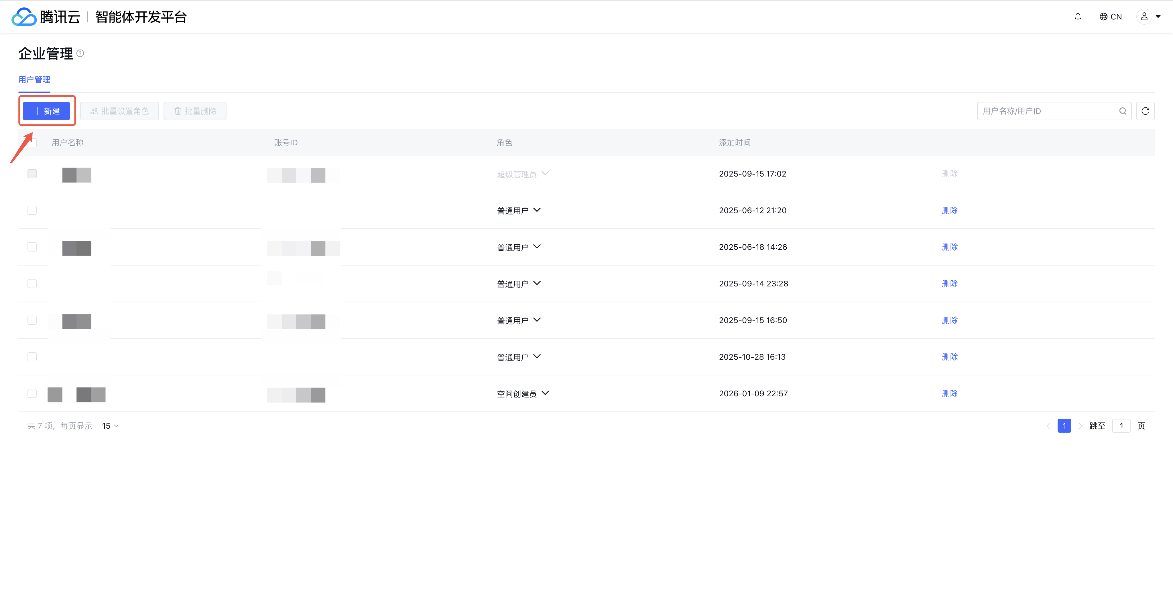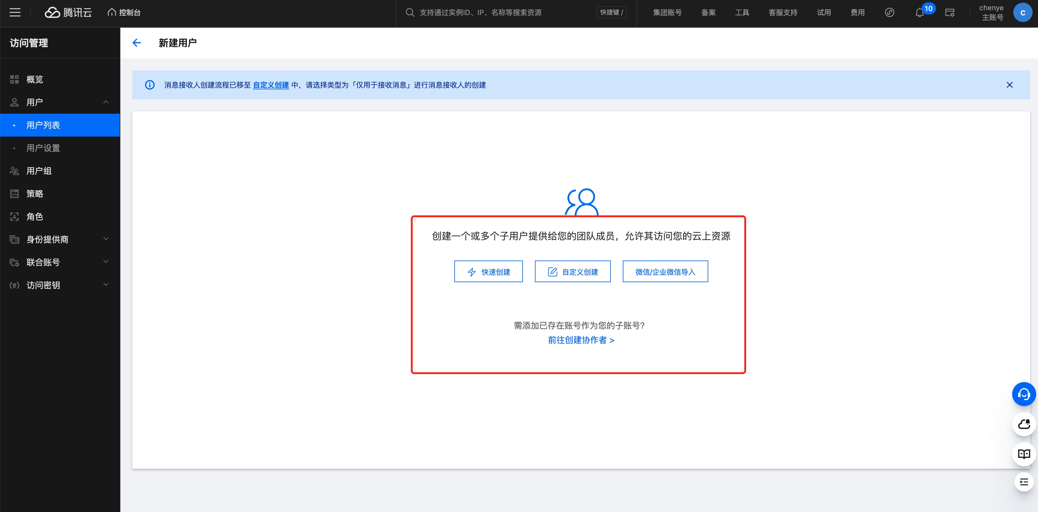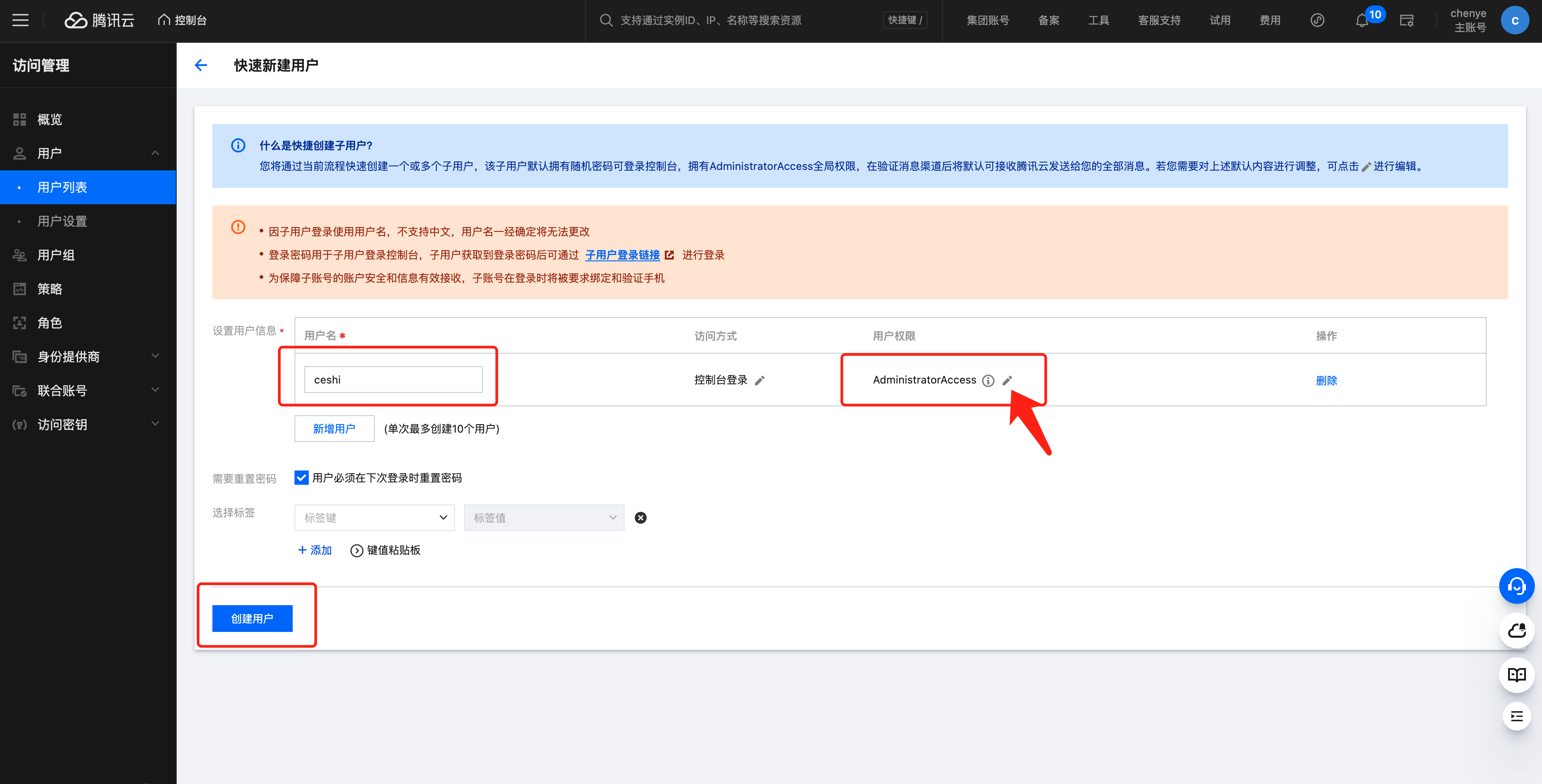 1.2 在角色管理,单击添加用户后跳转到访问管理界面进行添加子账号用户。