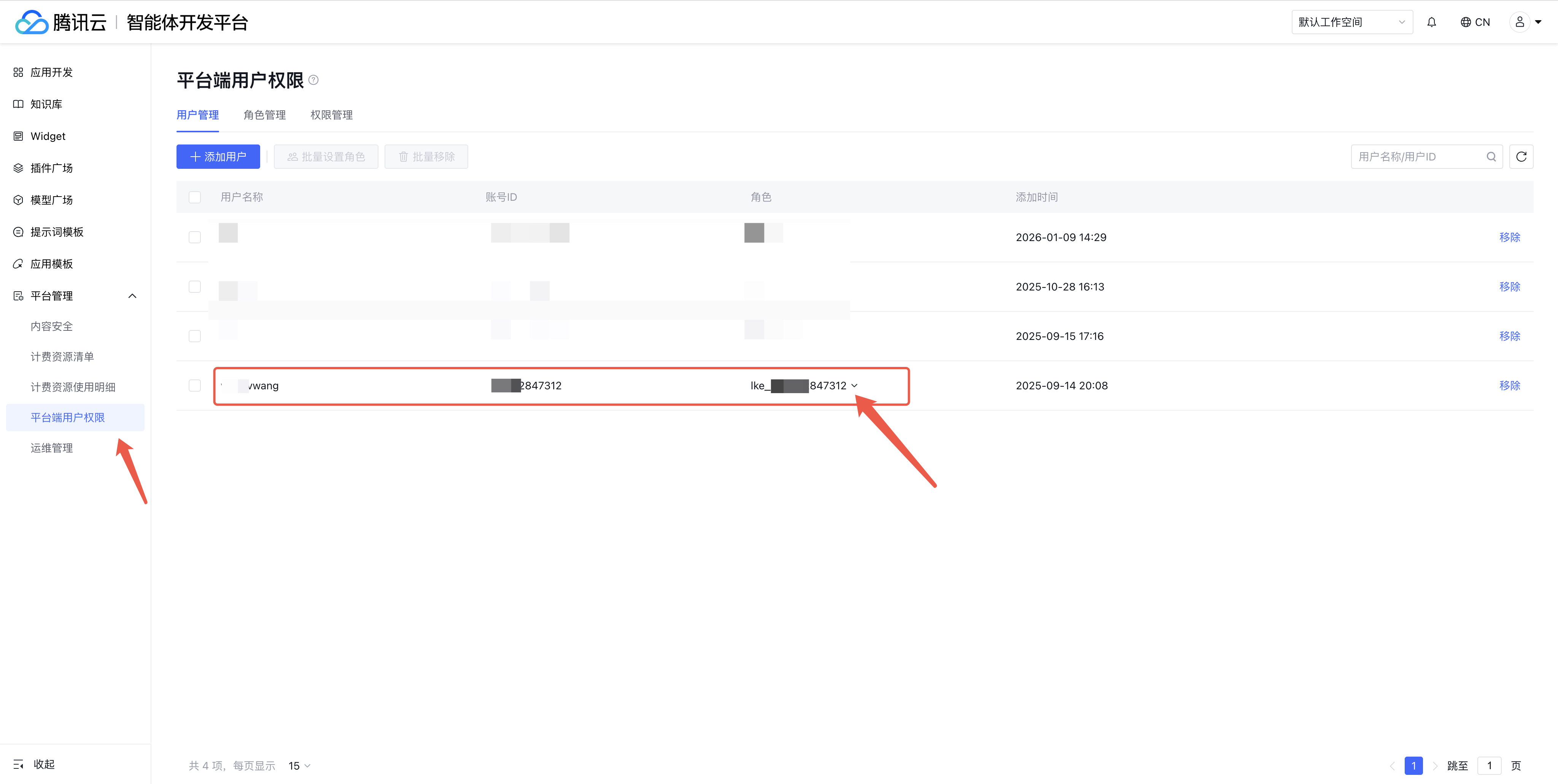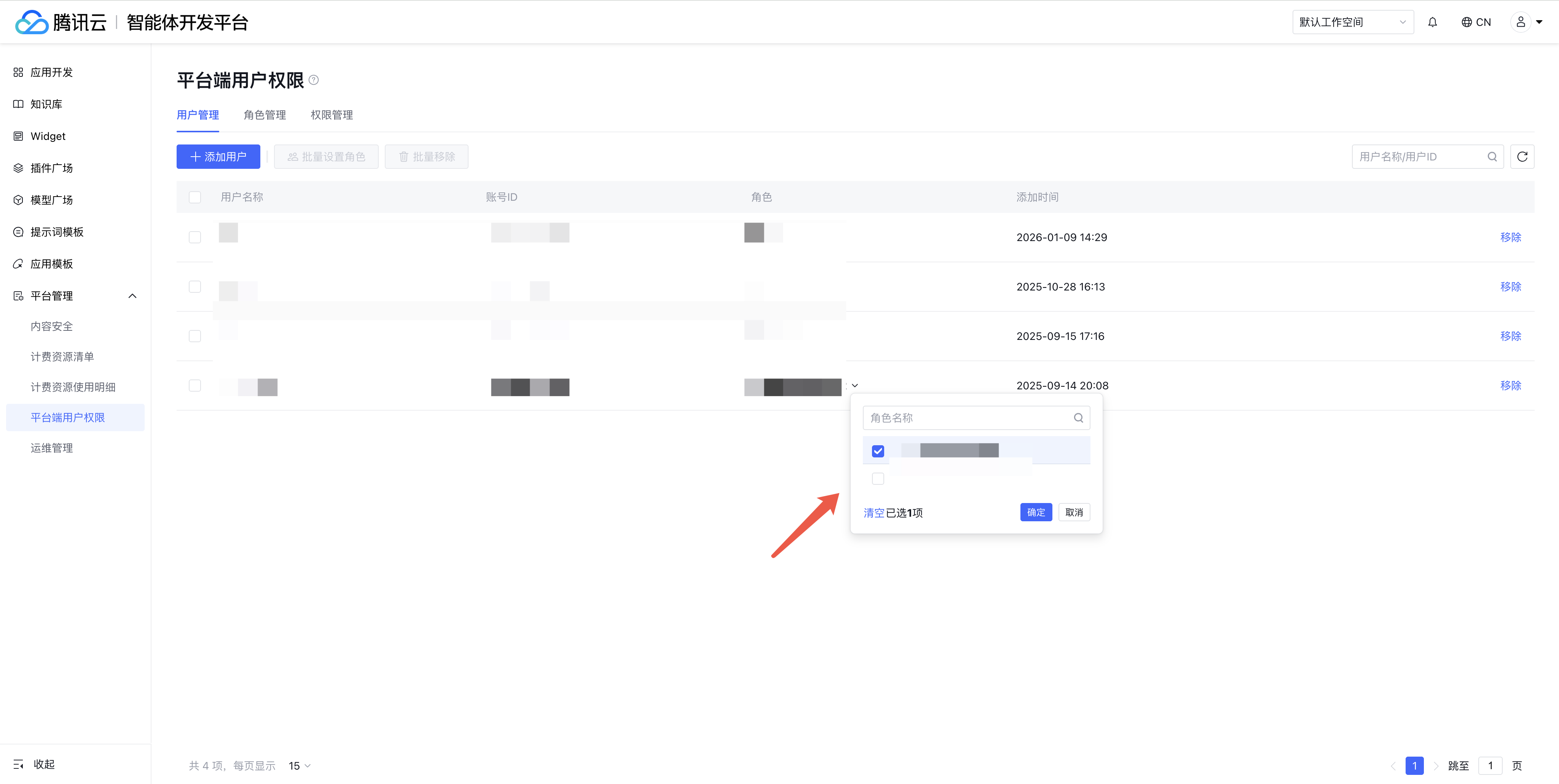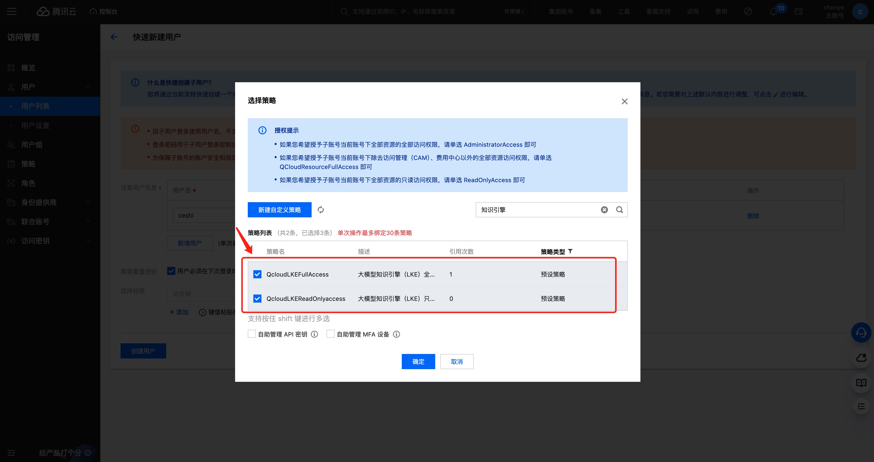 1.3.3 若需用户能访问并操作腾讯云智能体开发平台,需在用户权限处给予对应子账号腾讯云智能体开发平台(原大模型知识引擎)的读写权限。
