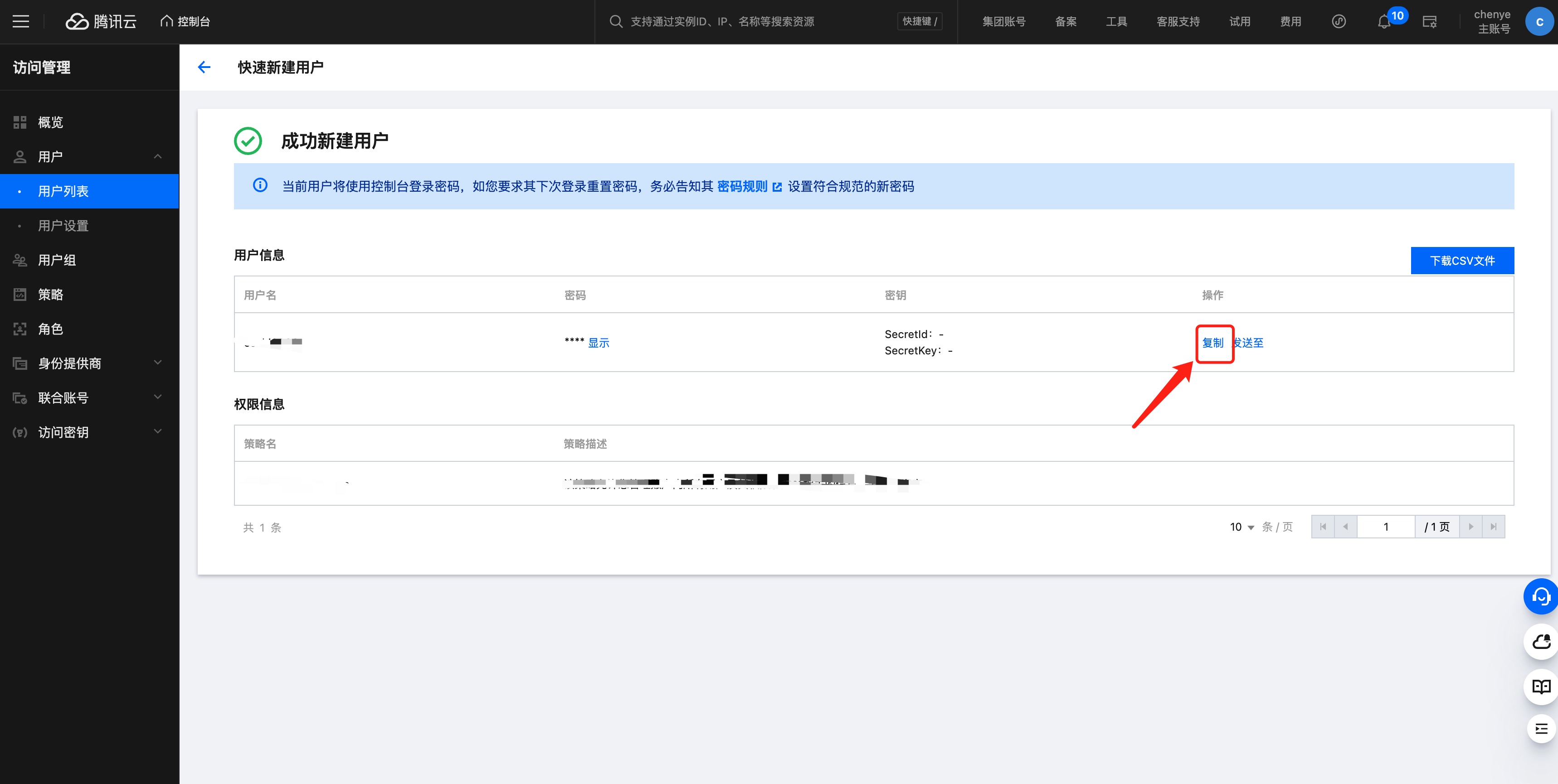 1.4 点击快速创建后即可复制对应的子账号密码。