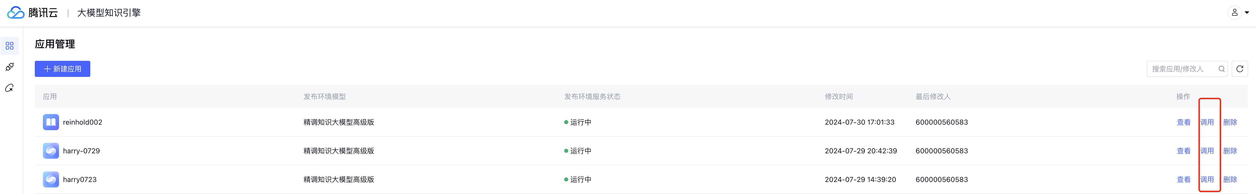 应用发布之后,【调用】按钮才可以使用,否则按钮是置灰的状态。