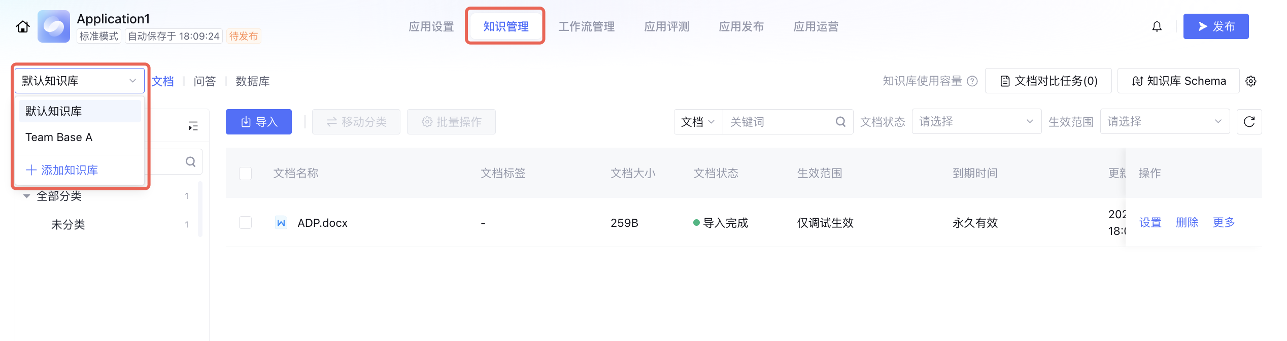 在应用的知识管理中,仅能对该应用下的默认知识库进行切分干预;如需设置其余知识库,请前往知识库模块。